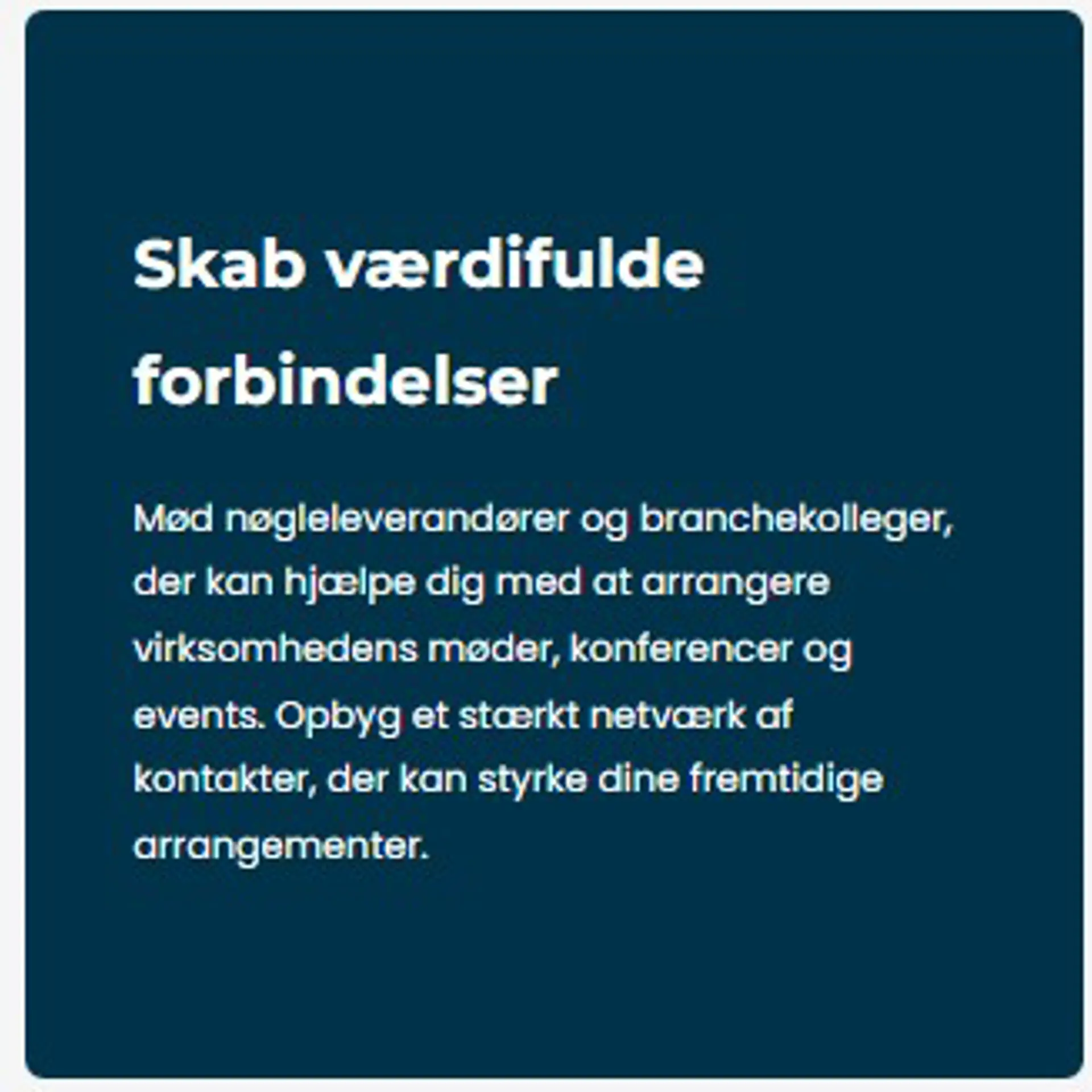 OPTIMEET Connect er et eksklusivt netværksarrangement designet til at styrke din viden, udvide dit netværk og inspirere dig til at skabe endnu bedre arrangementer. Vi samler nøgleaktører fra hele møde- og eventbranchen, inklusive hoteller, konferencesteder, teambuildingbureauer, destinationer, foredragsbureauer, og mange flere. Her får du mulighed for at deltage i korte, fokuserede 15-minutters møder, hvor du kan udforske nye muligheder og finde de helt rette leverandører til dine næste møder og arrangementer.