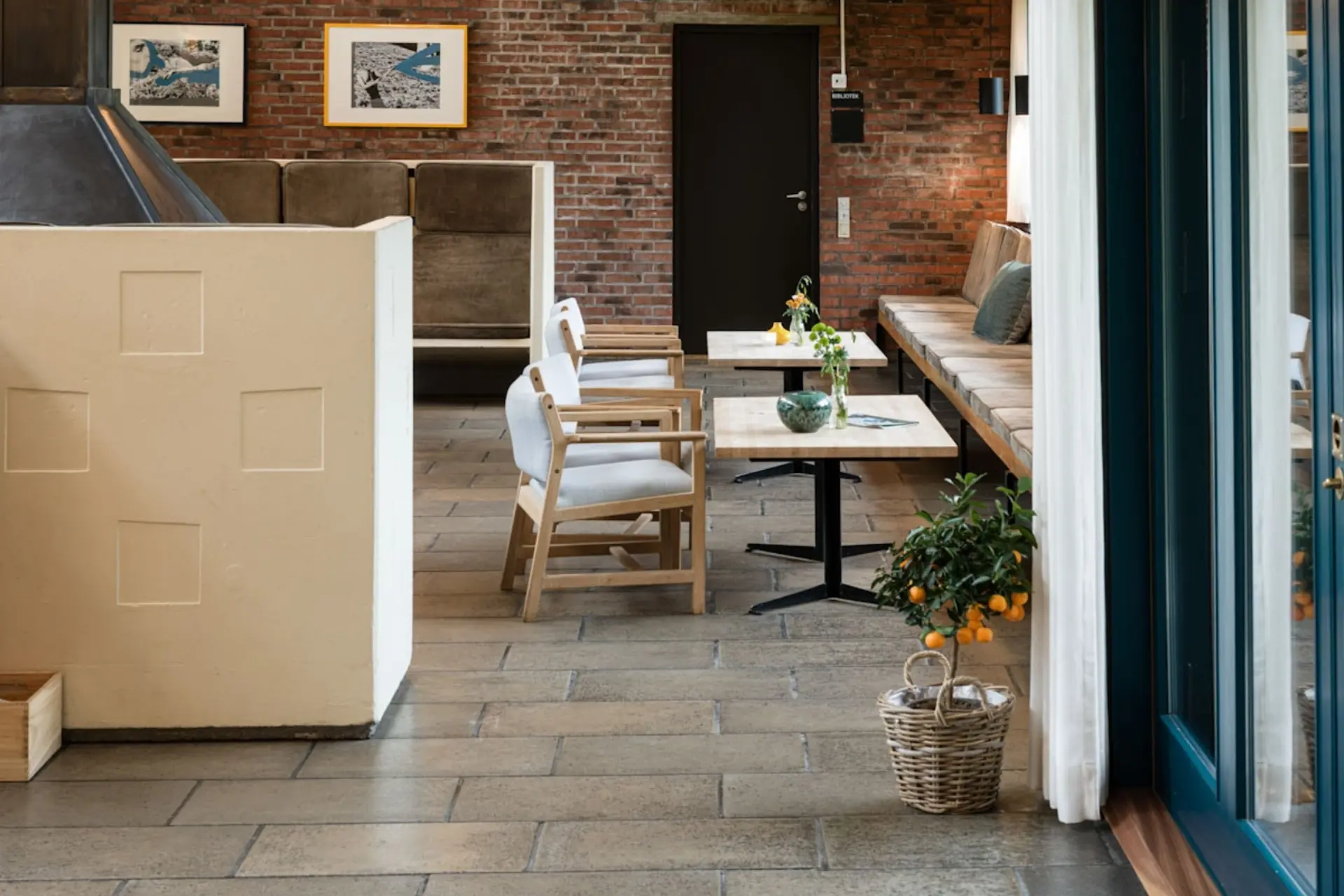 Murstenene er varme. Loftshøjden generøs. Udsigten grøn og levende. Får på marken. Kunst på væggene. 60’er-design med kant og karakter.