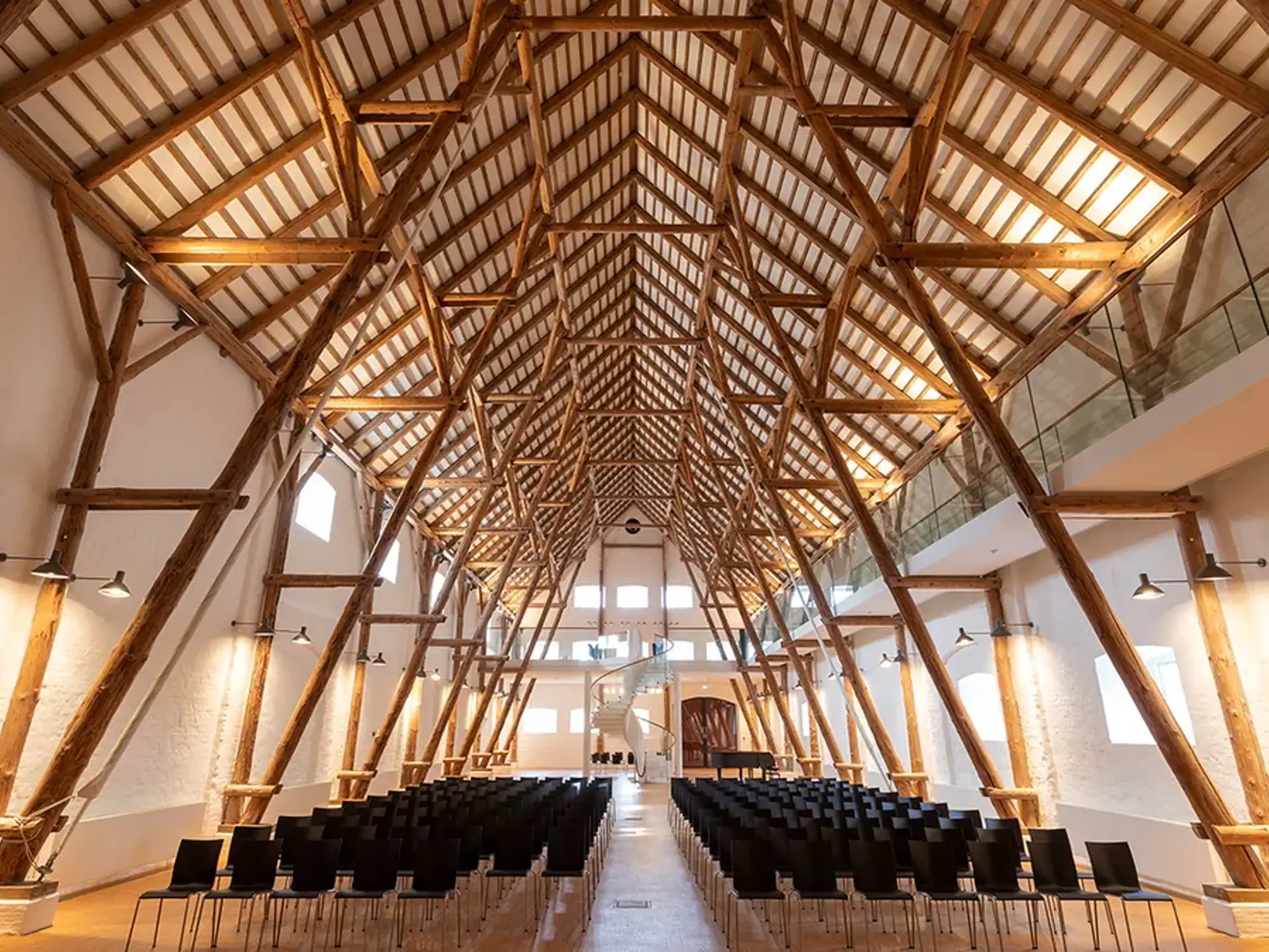 Vi har bl.a. vores imponerende Staklade, der er en moderne multisal med 14 meter til loftet. Stakladen prydes med spær fra gulv til loft, har en helt fantastisk akustik og kan rumme fra 50-350 gæster. Stakladen kan deles op i tre sektioner af smukke, hvide sejl og er helt unik til møder og konferencer. Alle der træder ind i laden bliver overvældet af en helt fantastisk ro og nærvær.