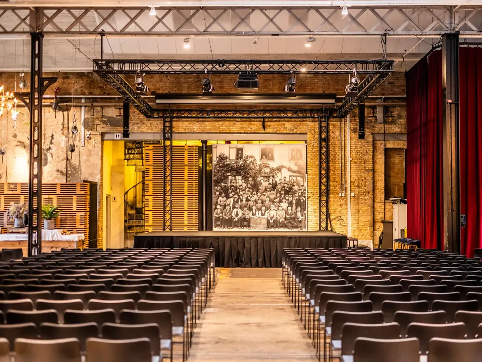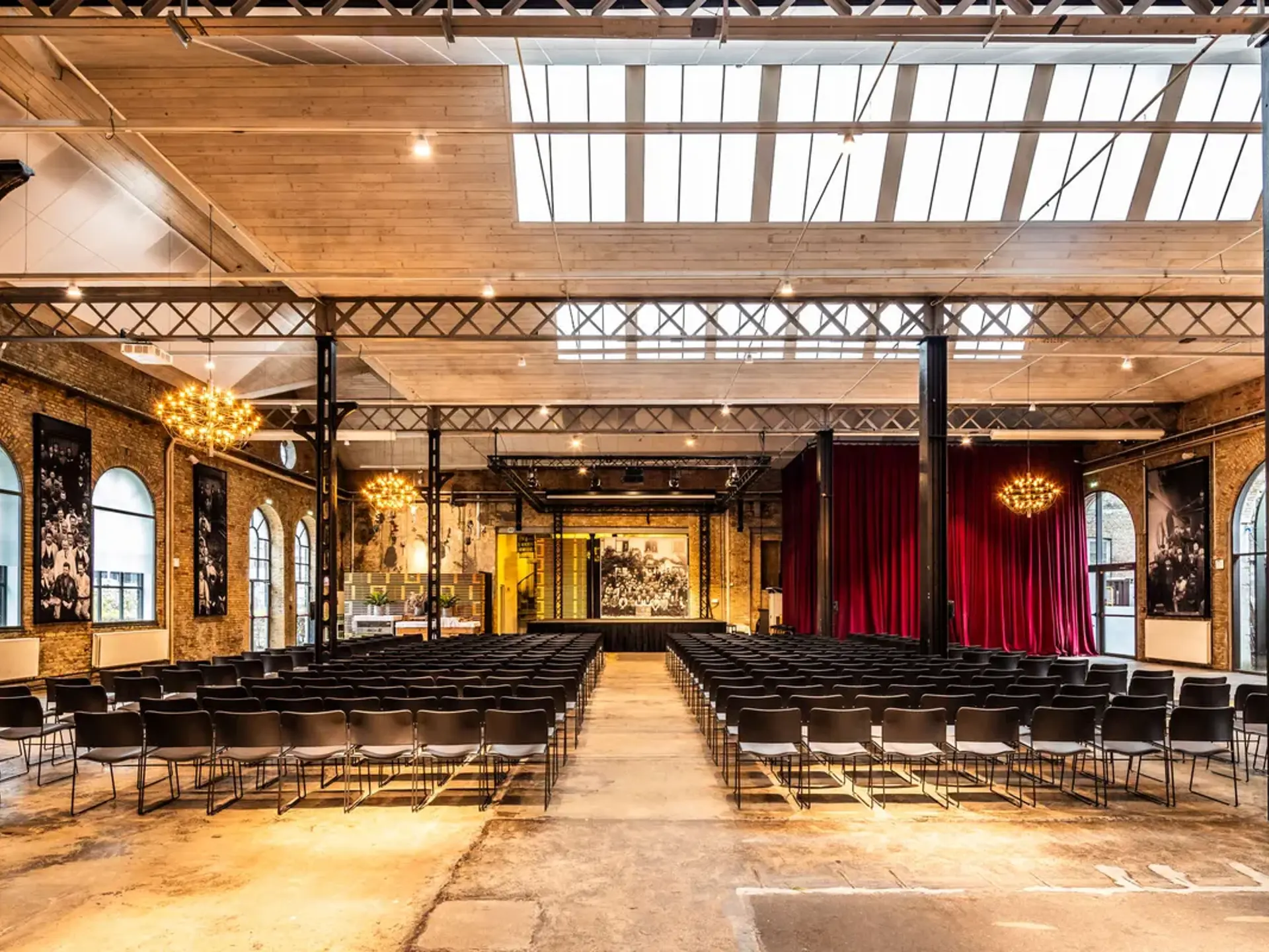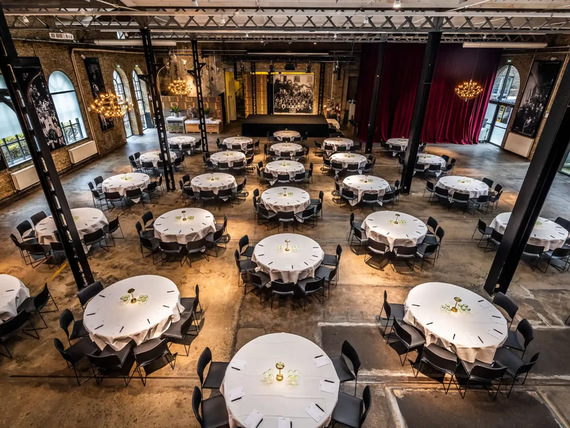 - Centralværkstedet: Op til 700 deltagere i stolerække og 350 ved runde borde. Med en stor scene og et loungeområde på balkonen får I fleksibilitet til både konferencer og fester.