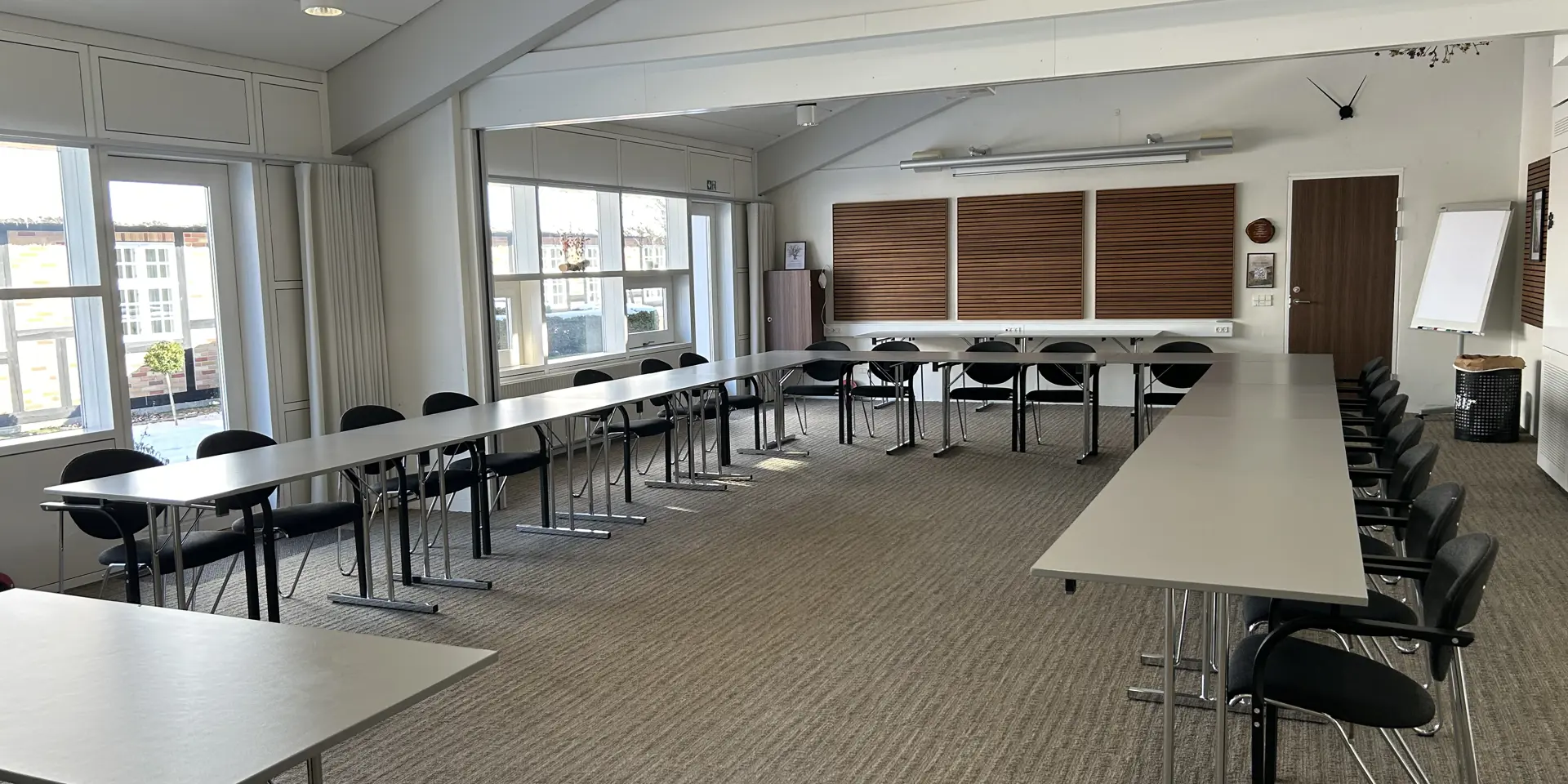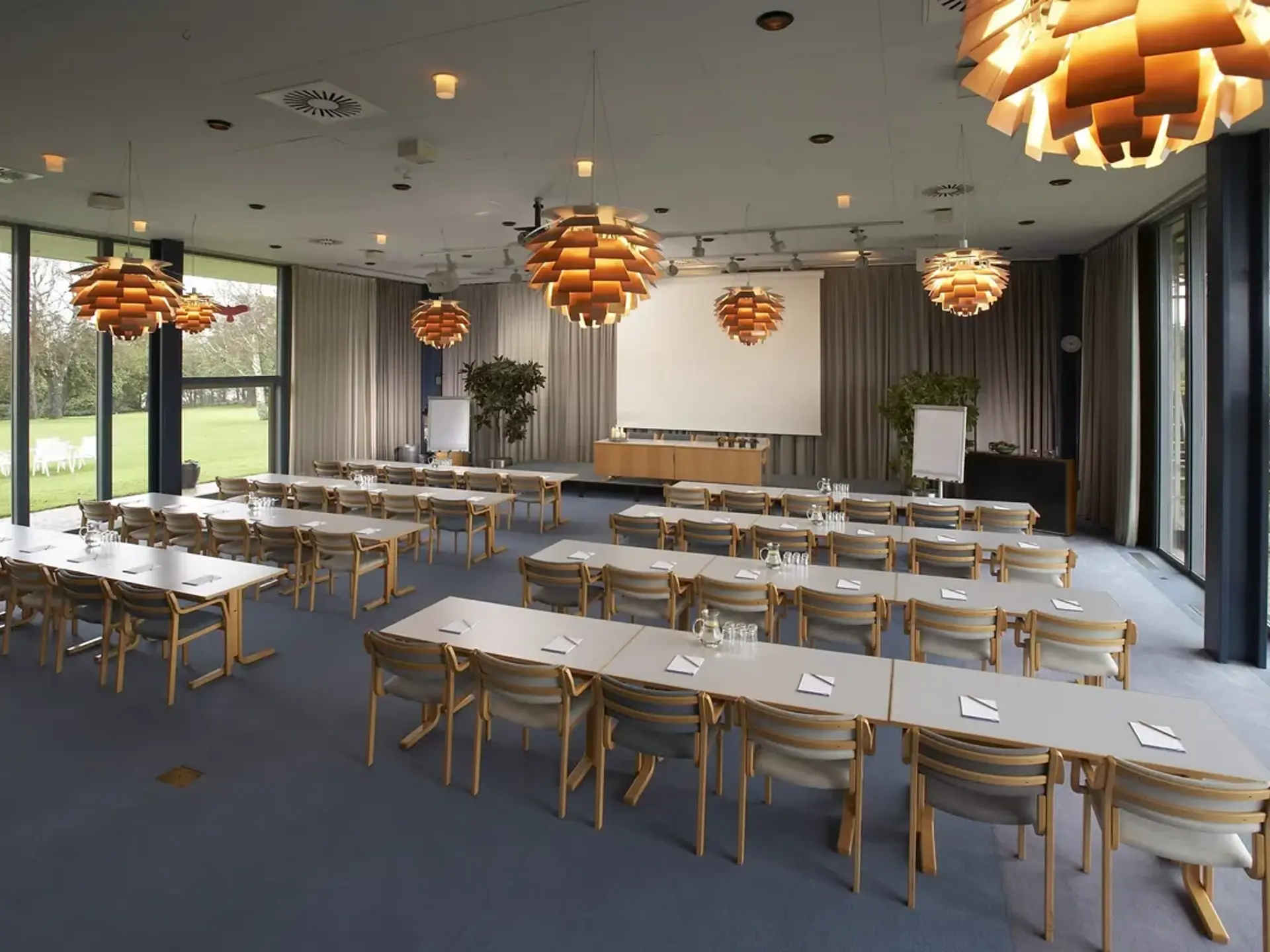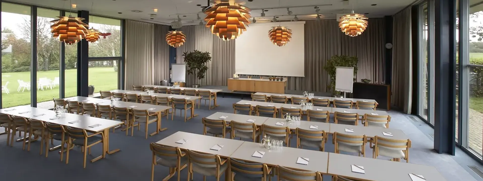 Vores største mødelokale med fantastisk udsigt over vand, park og mark. Indeholder projekter. Måler 15x13 meter og kan rumme op til 150 personer i biografopstilling.