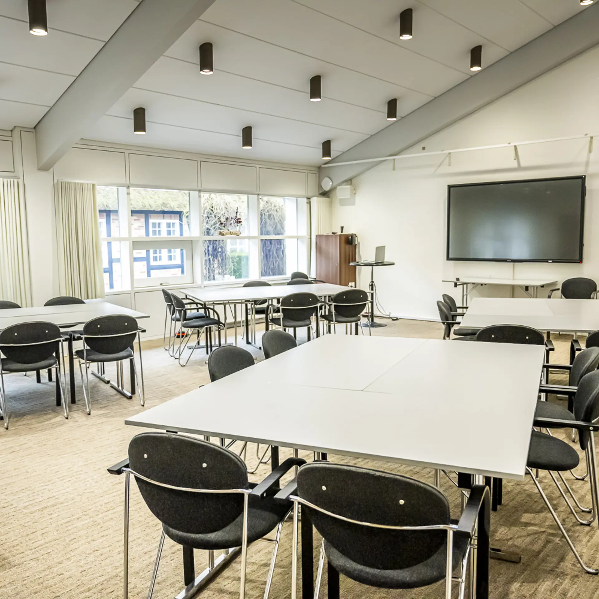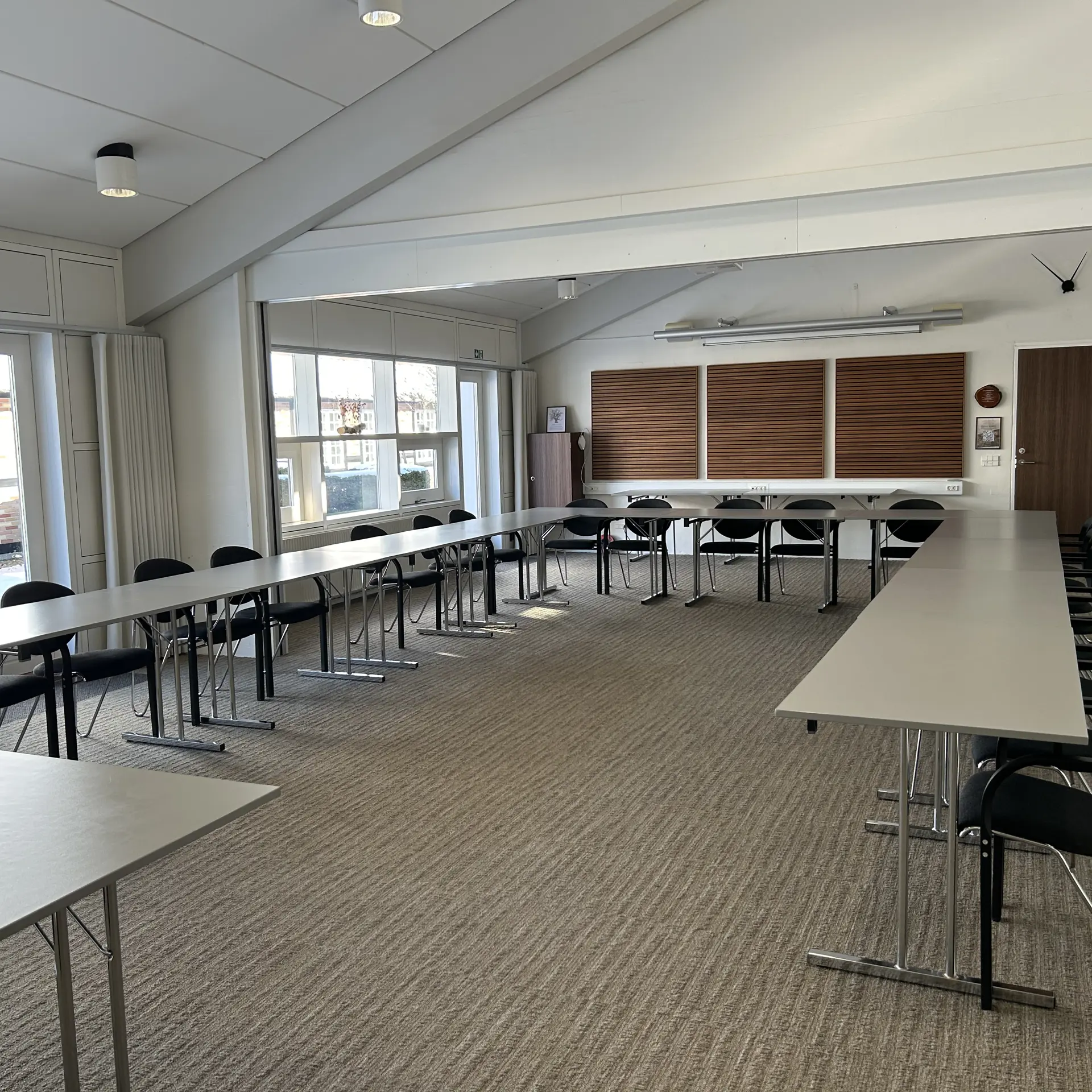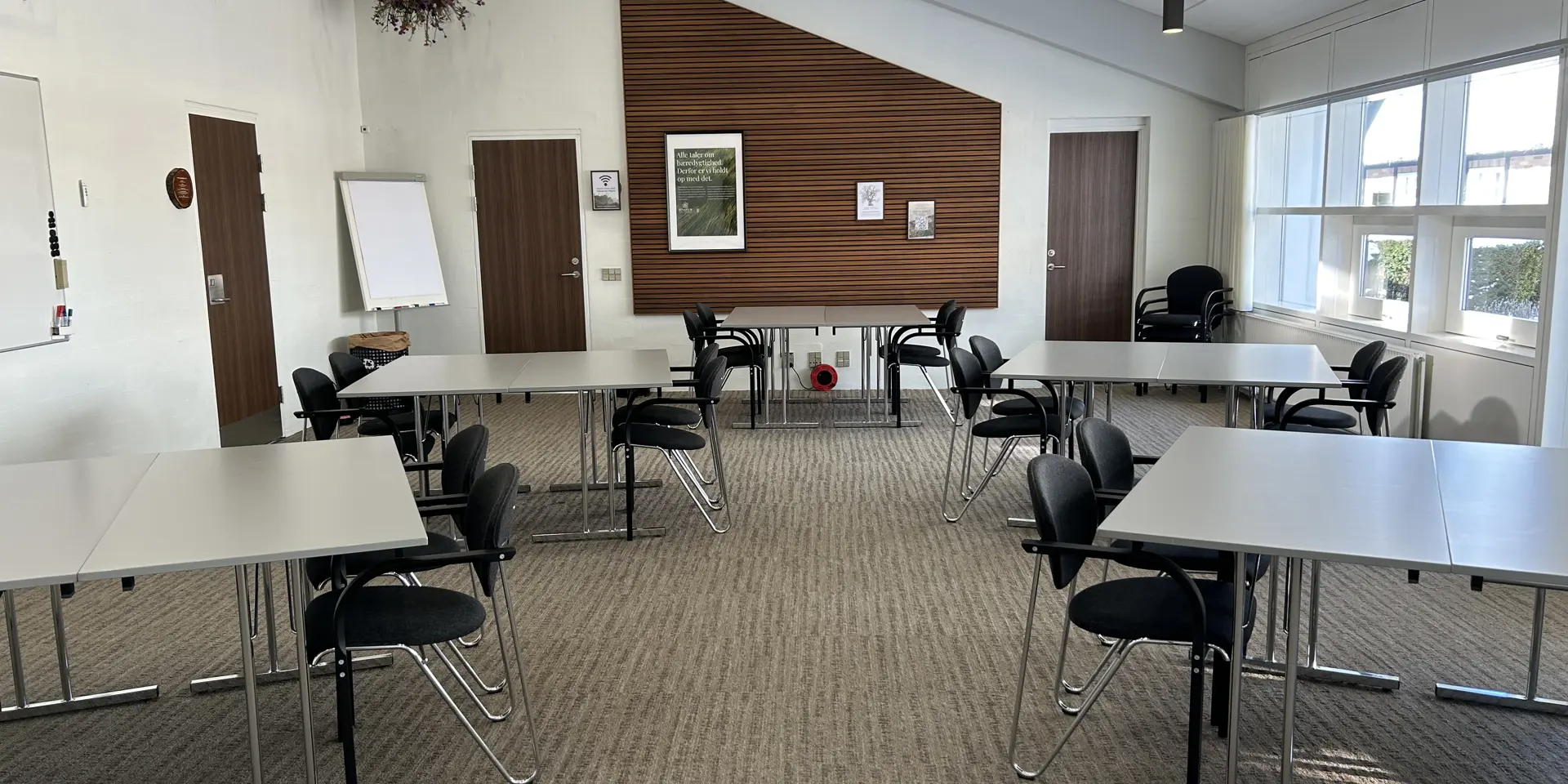 Vores største mødelokale med fantastisk udsigt over vand, park og mark. Indeholder projekter. Måler 15x13 meter og kan rumme op til 150 personer i biografopstilling.