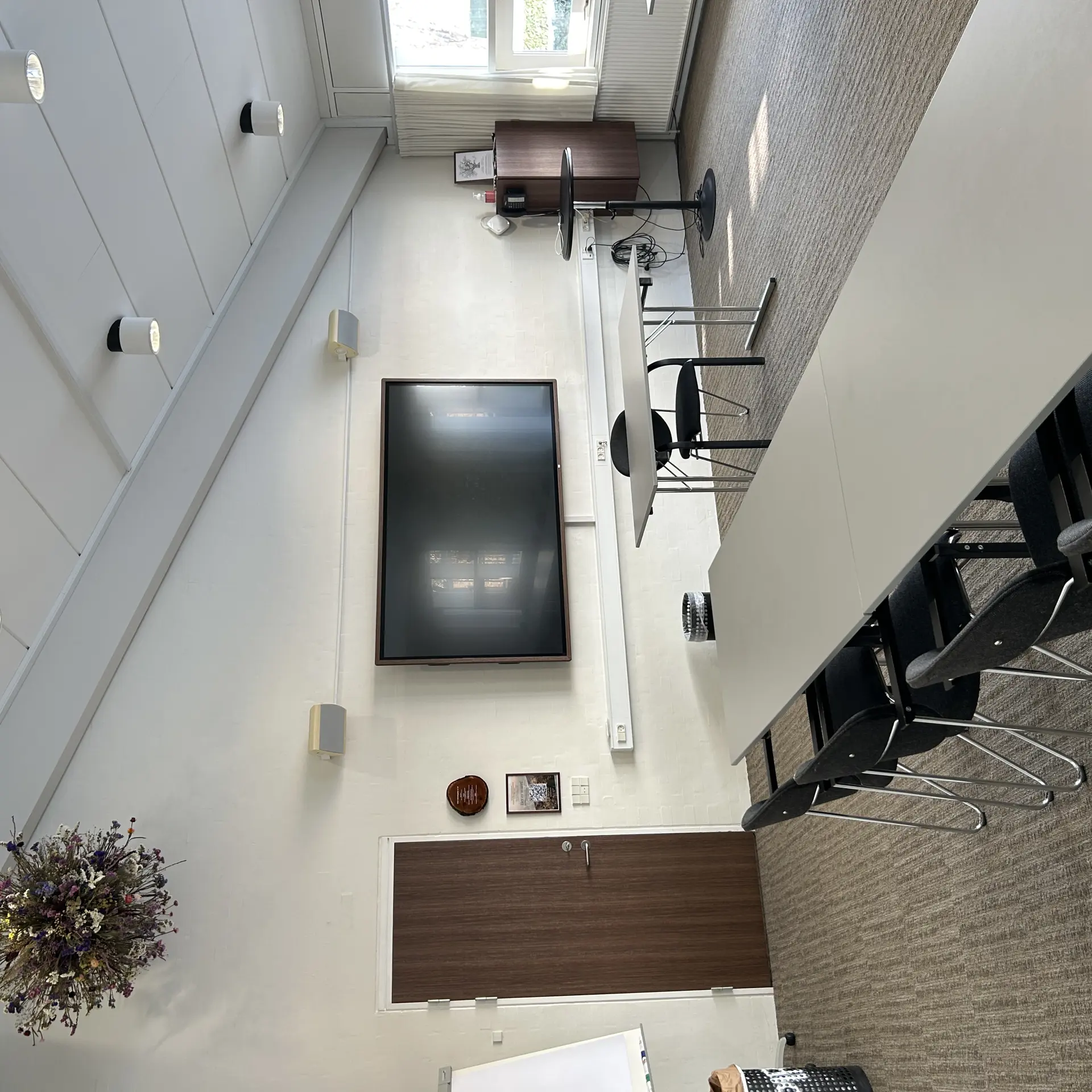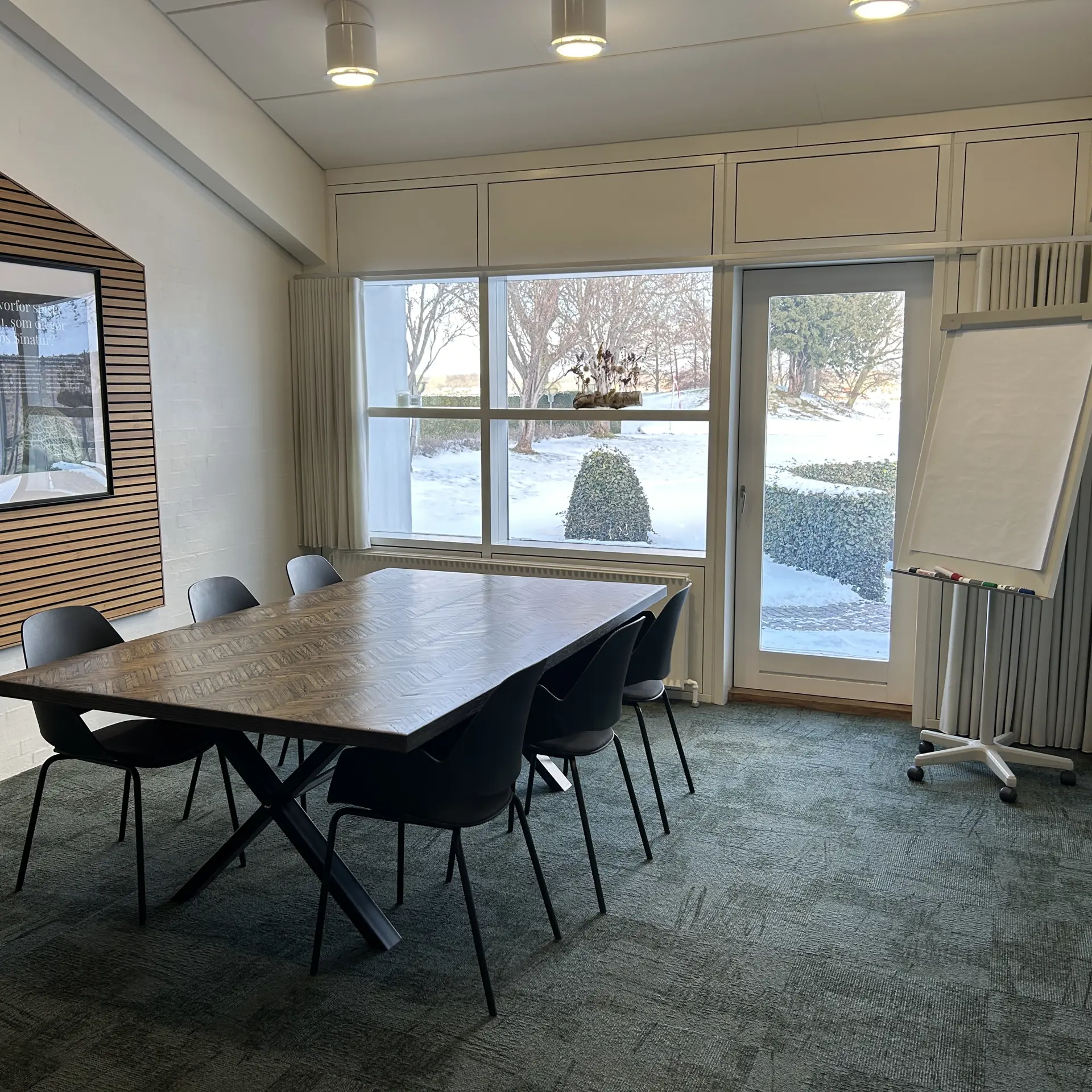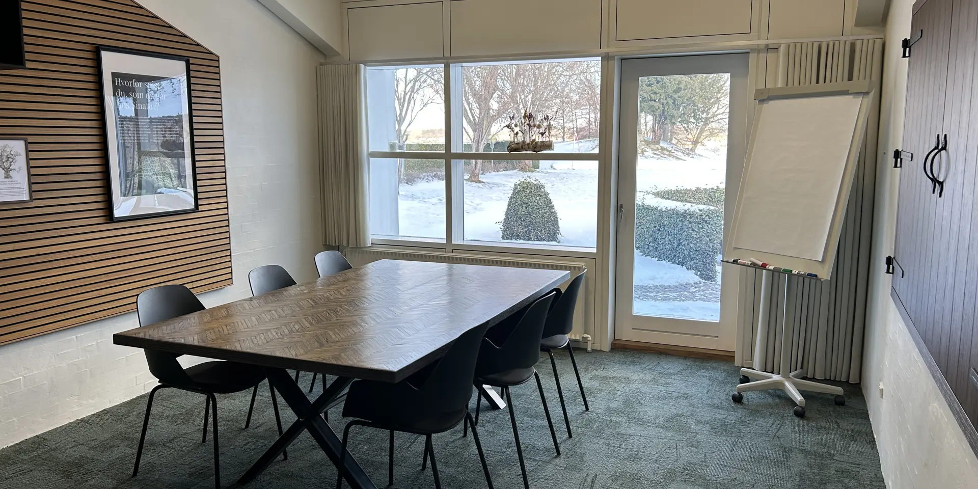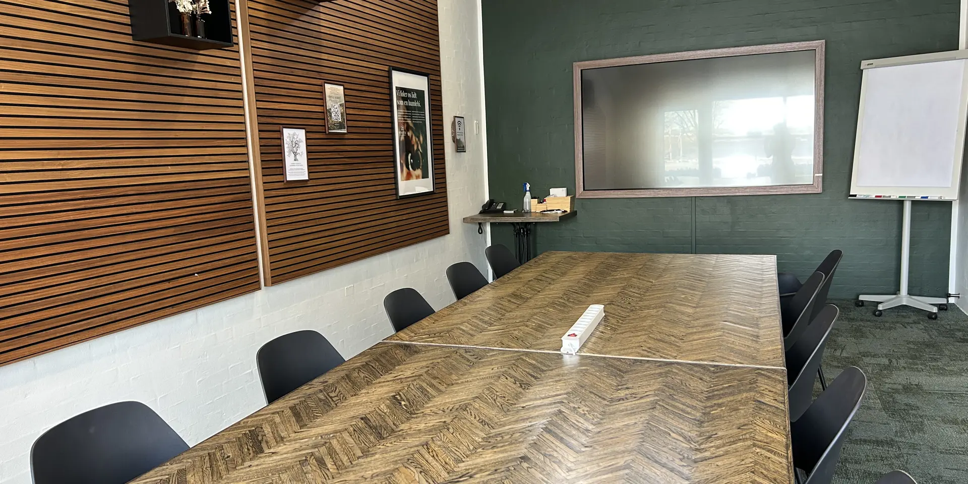 Hyggeligt lille mødelokale med skærm og whiteboard. Benyttes til det lille møde eller som grupperum. Måler 4,5x5 meter og kan rumme op til 6 personer.