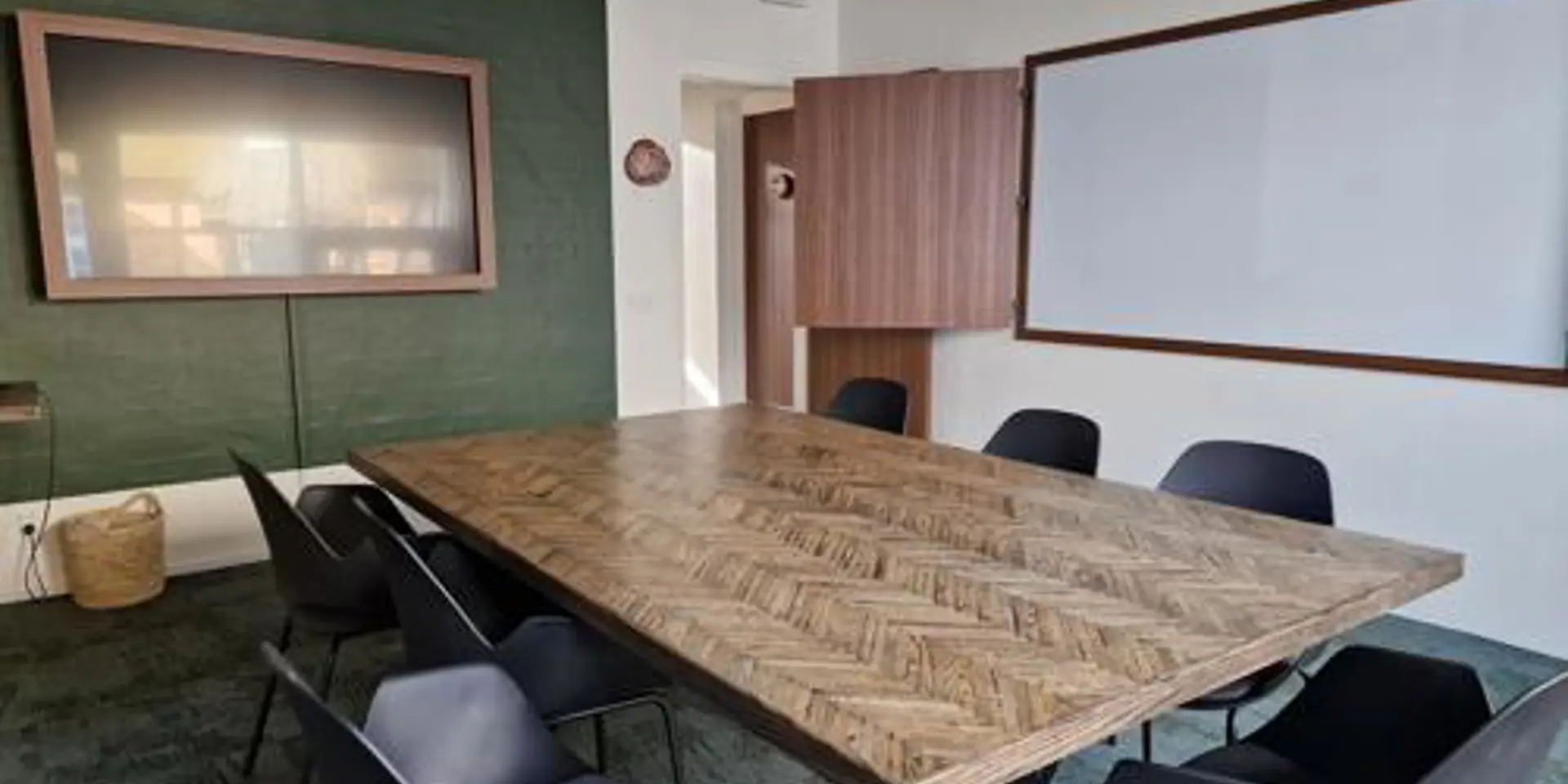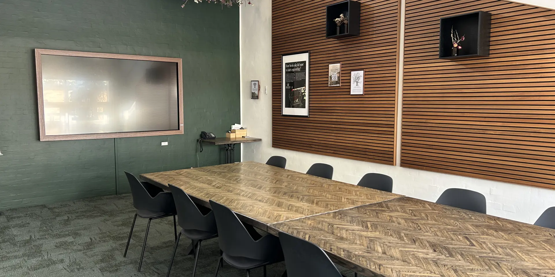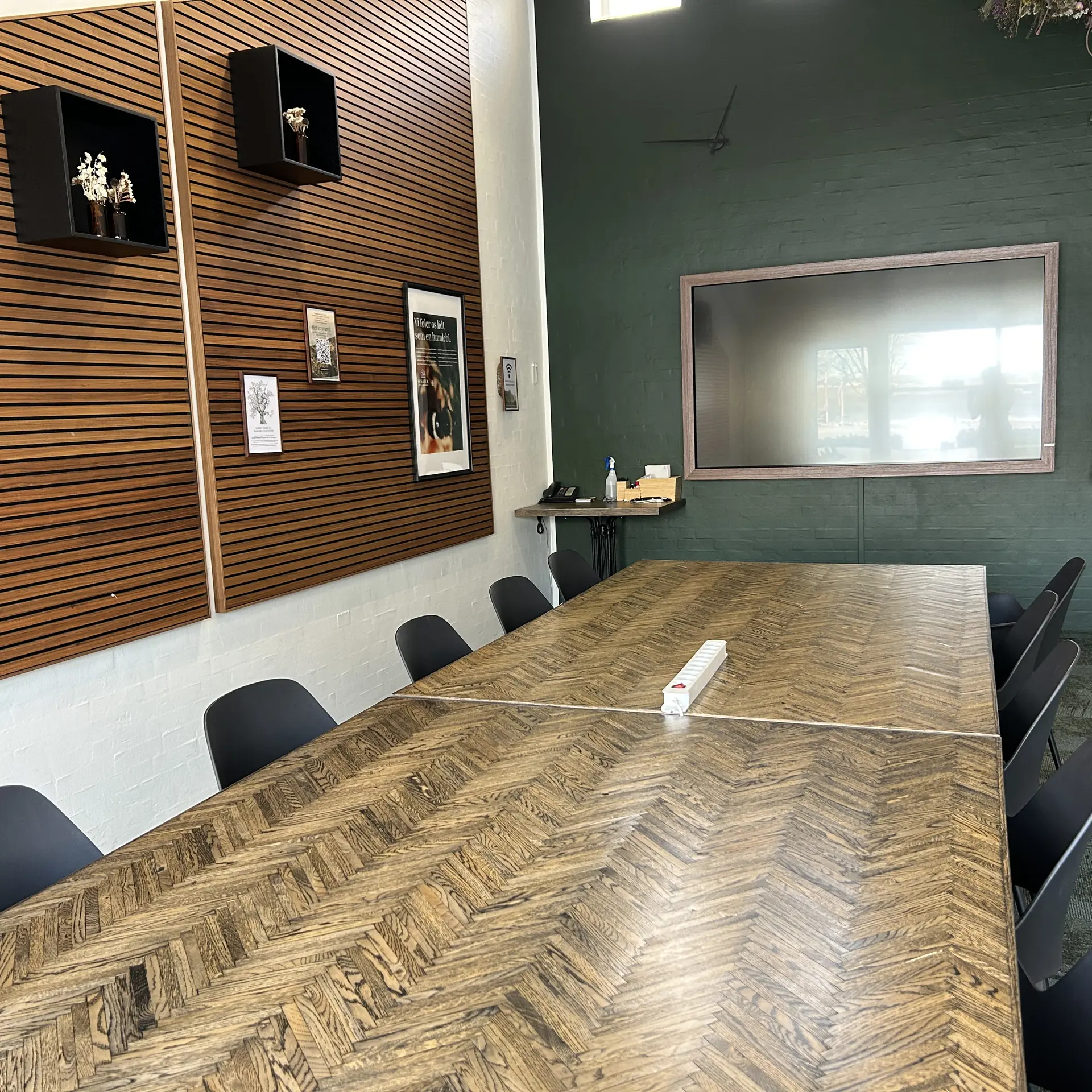 Hyggeligt lille mødelokale med skærm og whiteboard. Benyttes til det lille møde eller som grupperum. Måler 4,5x5 meter og kan rumme op til 6 personer.