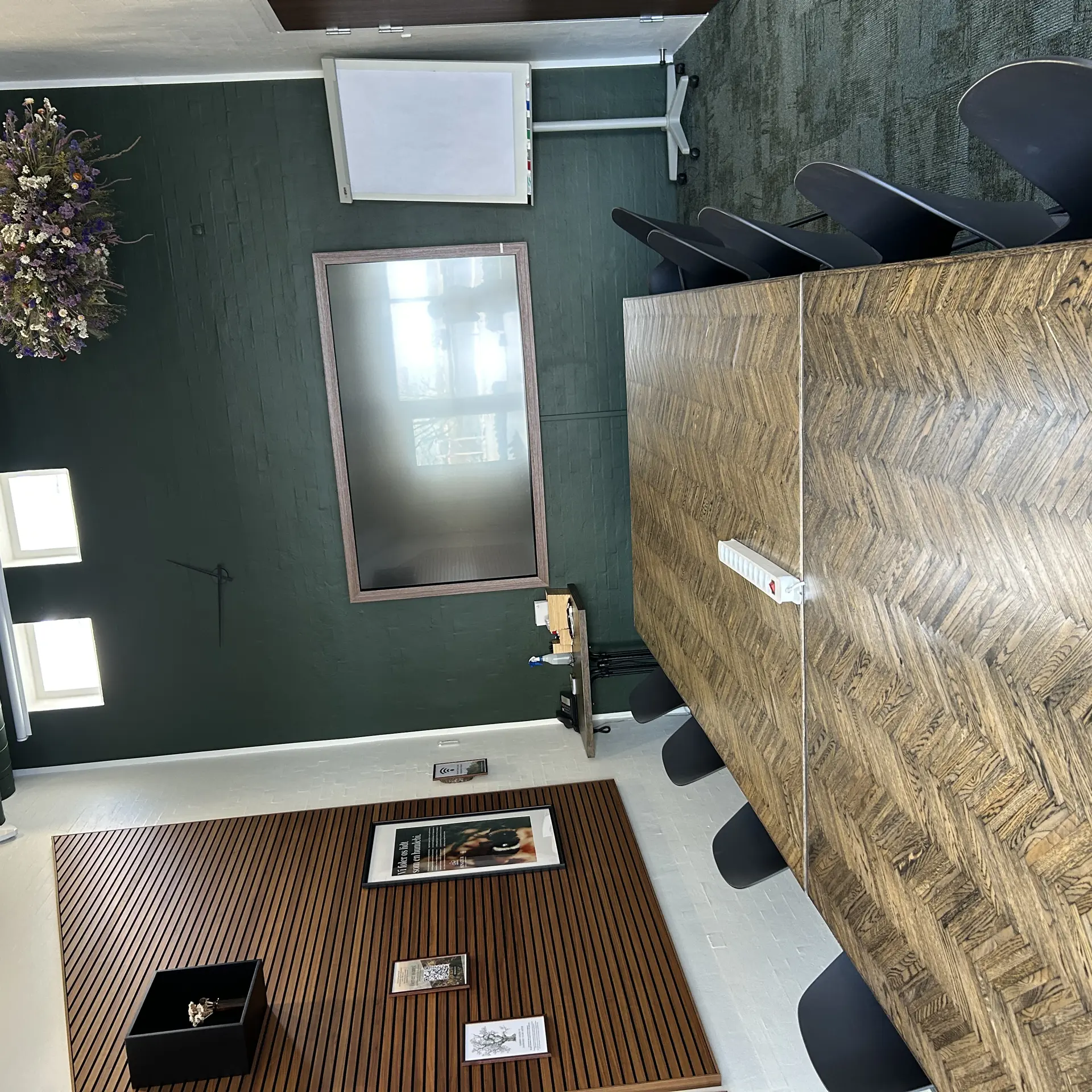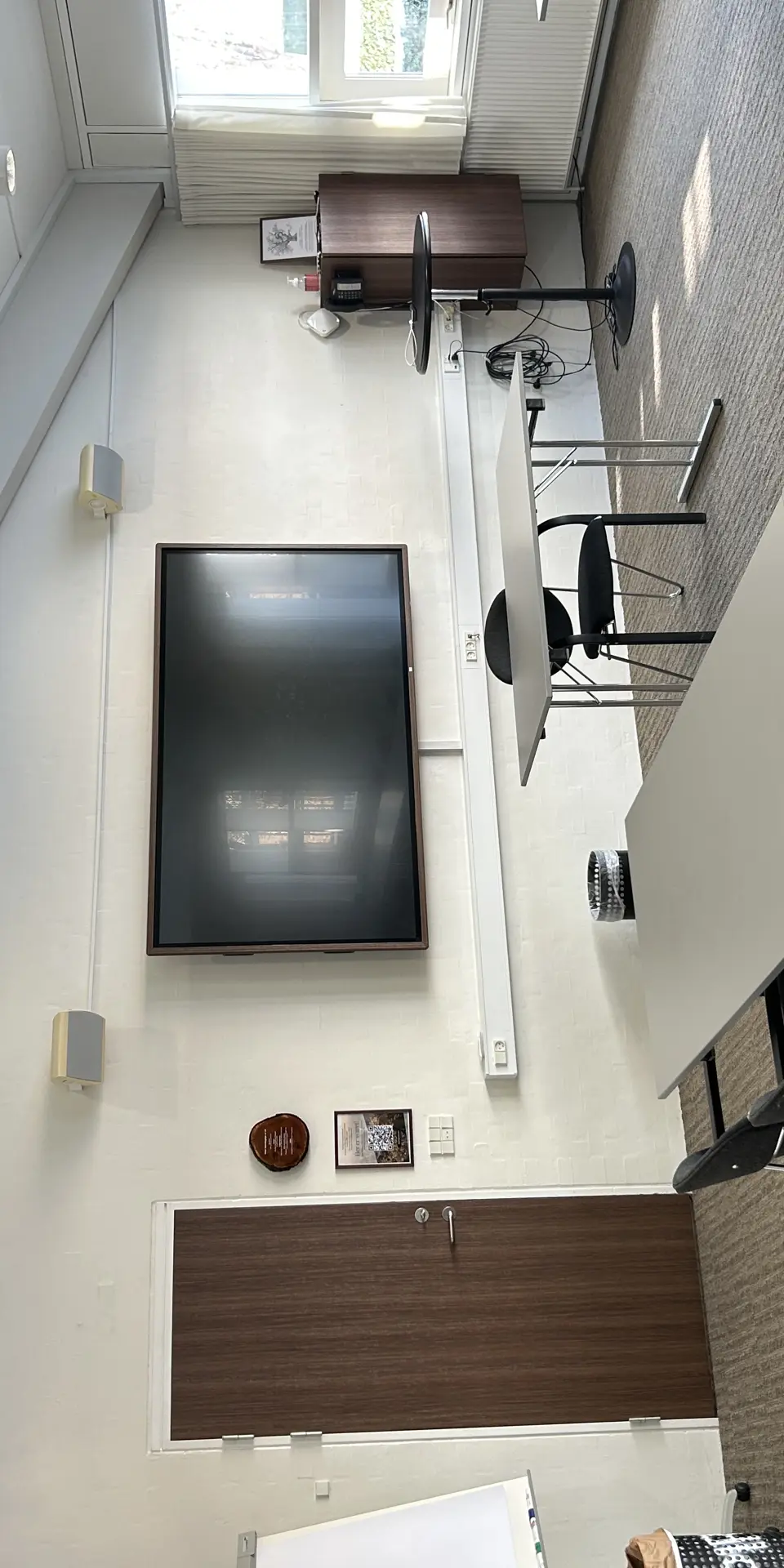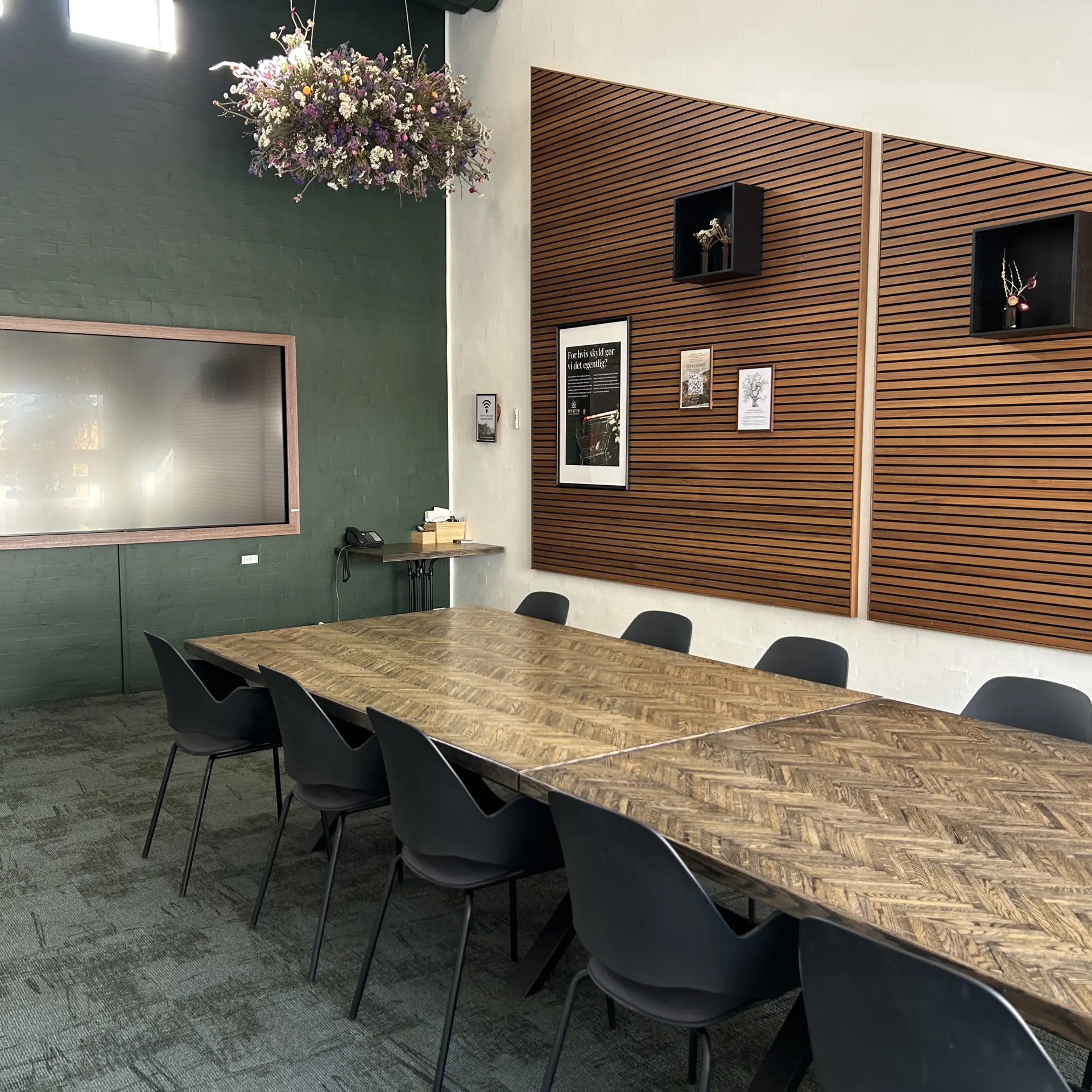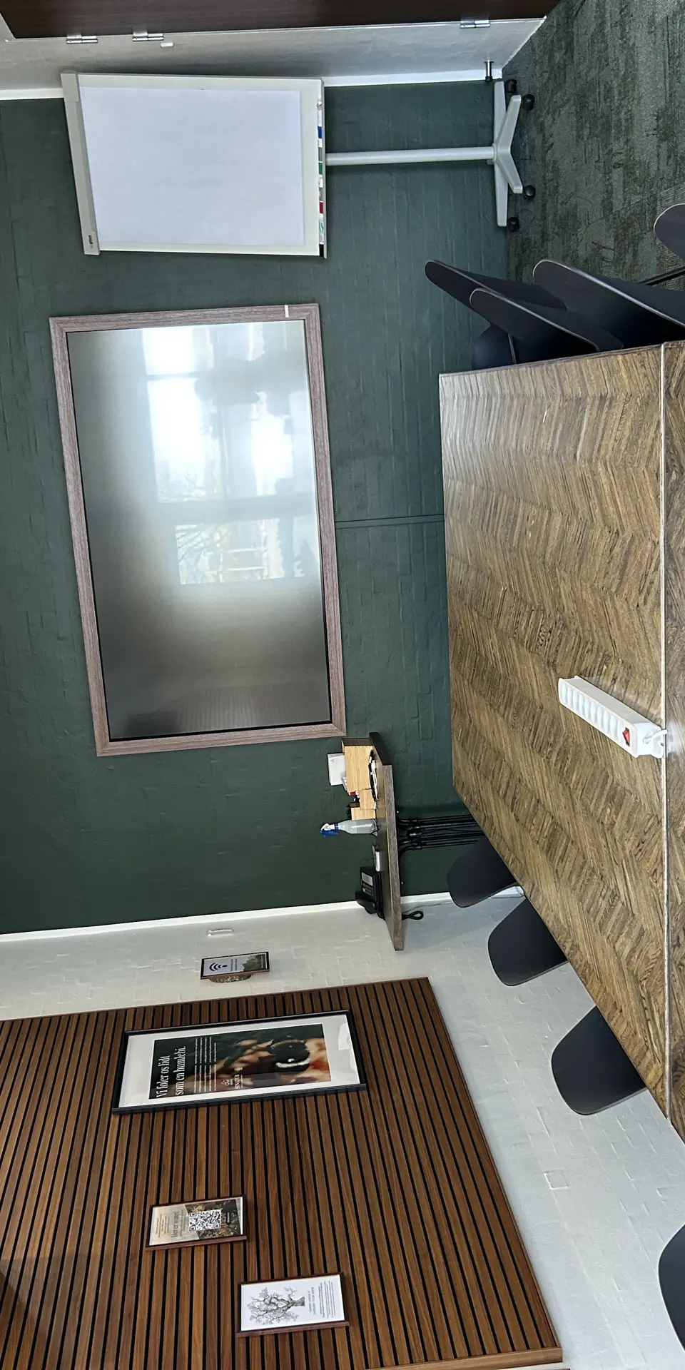Hyggeligt lille mødelokale med skærm og whiteboard. Benyttes til det lille møde eller som grupperum. Måler 4,5x5 meter og kan rumme op til 6 personer.