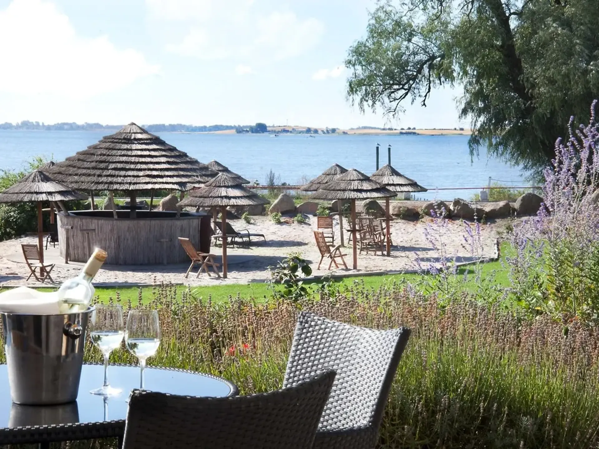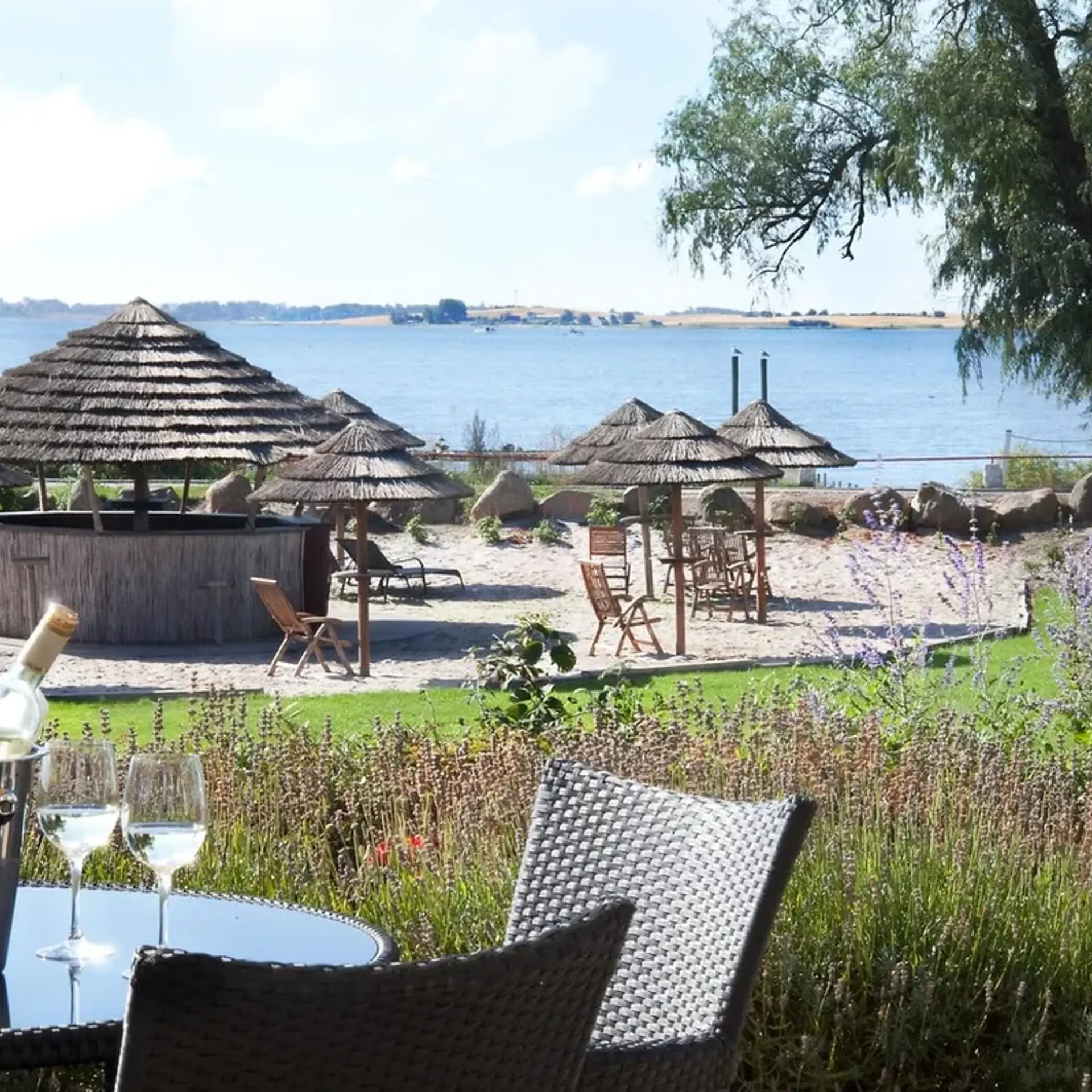 Strandbaren som ligger med på den store grønne plæne har parasoller, liggestole mm. – start konference, festen, selskabet her og overrask dine gæster…