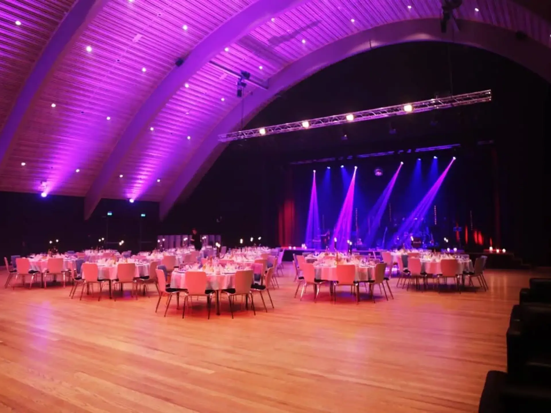 Vores konferencesal på ca. 520 m² kan tilpasses forskellige arrangementer, fra 50 til ca. 500 personer. Den buede lyse loft og mørkeblå vægge skaber en rolig og indbydende atmosfære, ideel for både formelle og afslappede arrangementer. Med fleksibel belysning og opsætning sørger vi for, at vores hal er perfekt til netop dit behov.