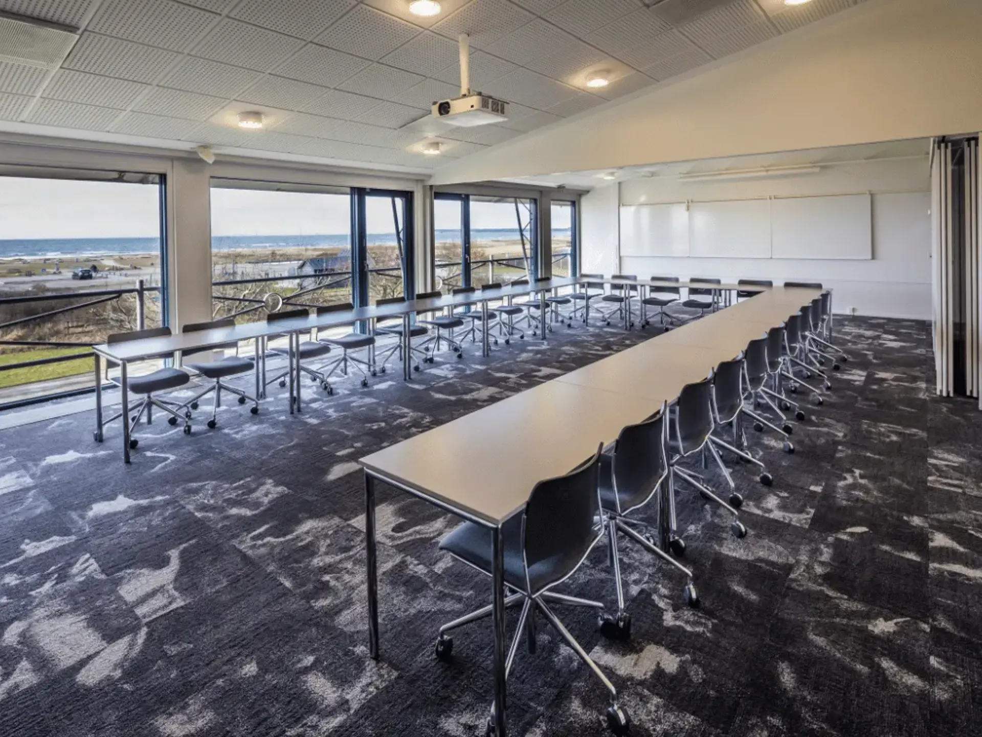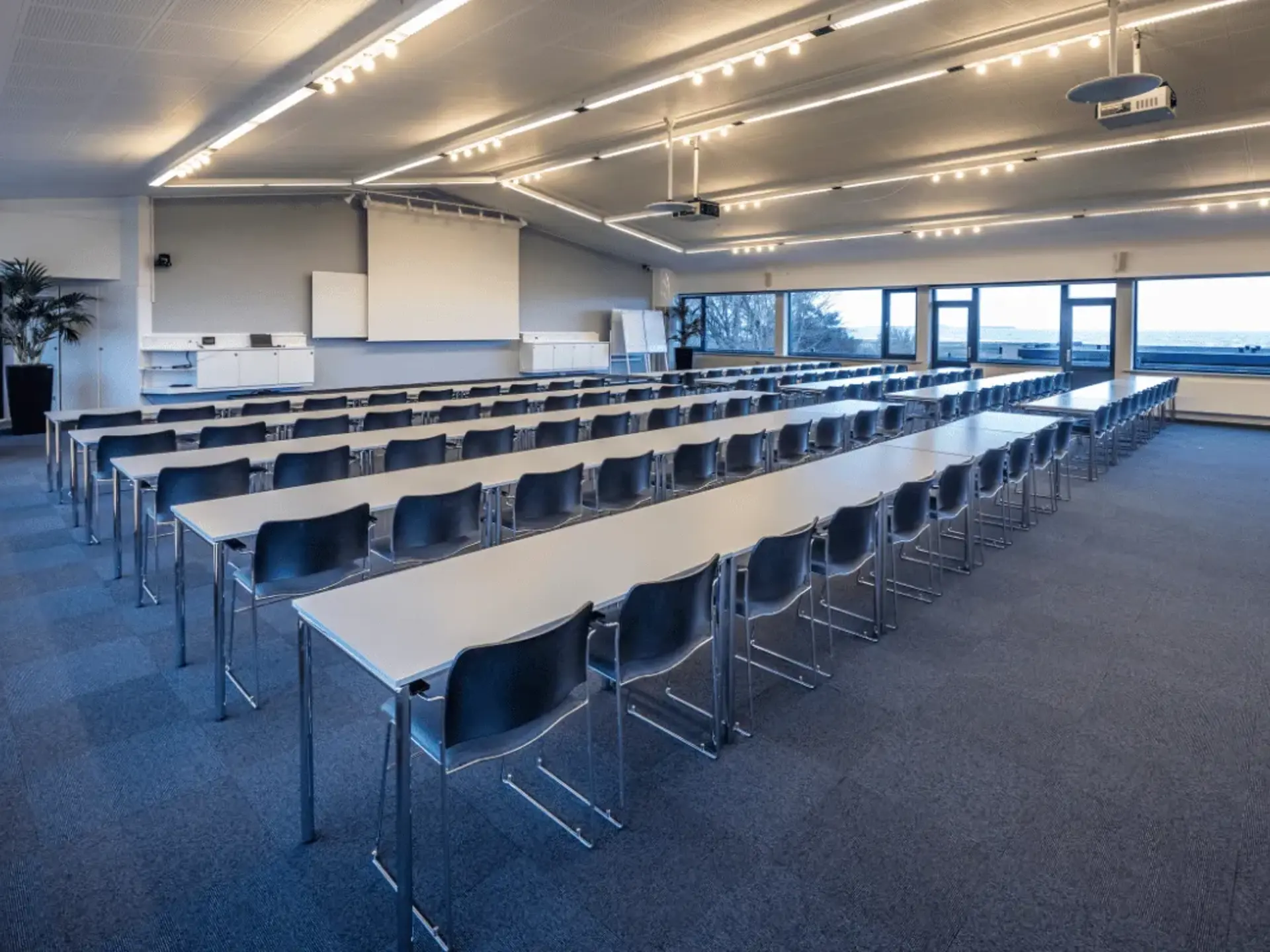 - AV-udstyr: Moderne udstyr inklusive LCD projektorer og kameraopsætning til online deltagelse