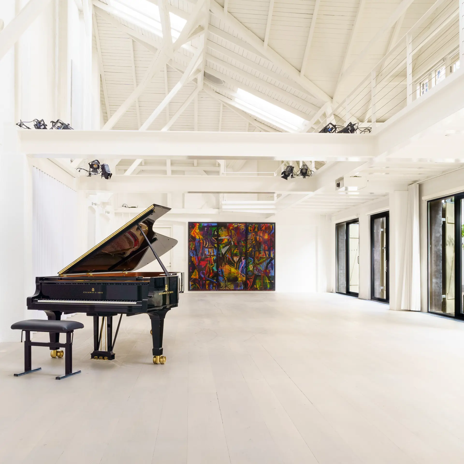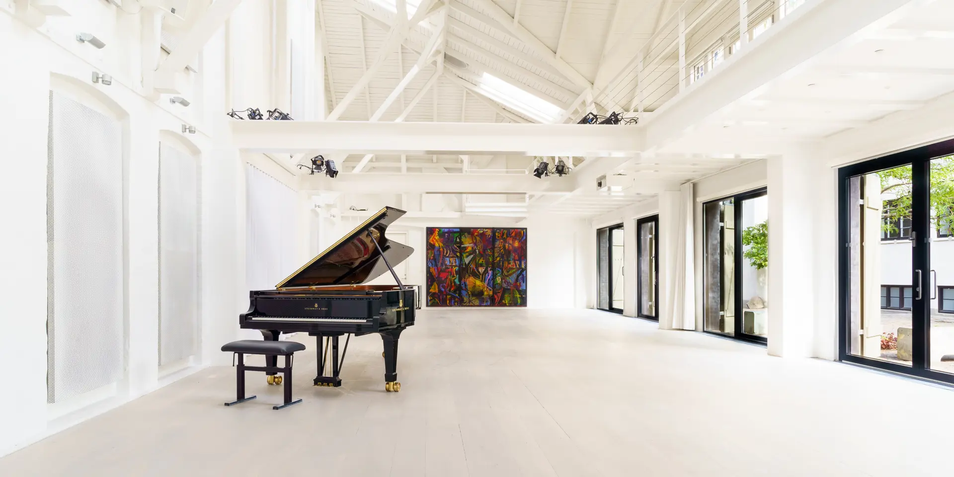 Koncertsal 160 m2 med balkon (18,6 x 7,9 m) højde: loft til kip 12 m. Under balkon 2,6 m.