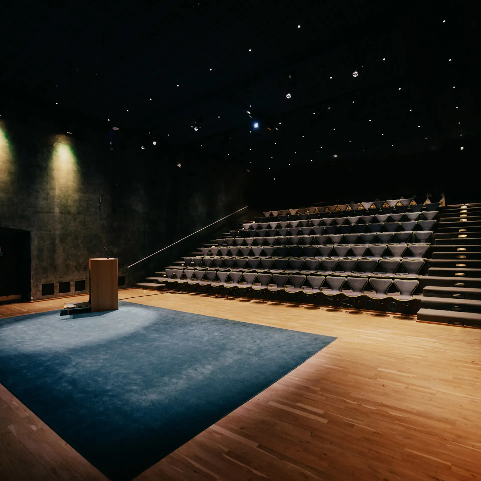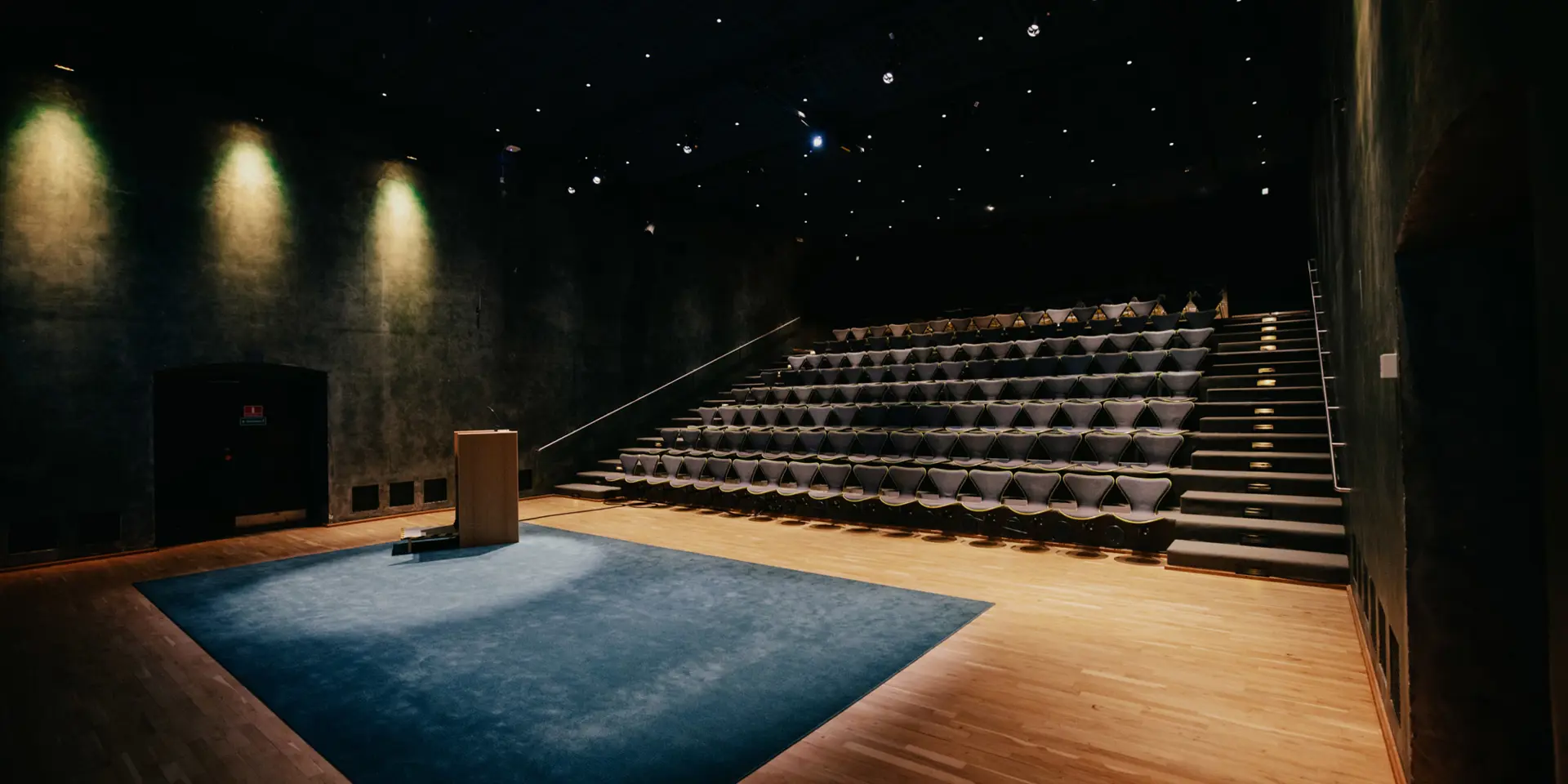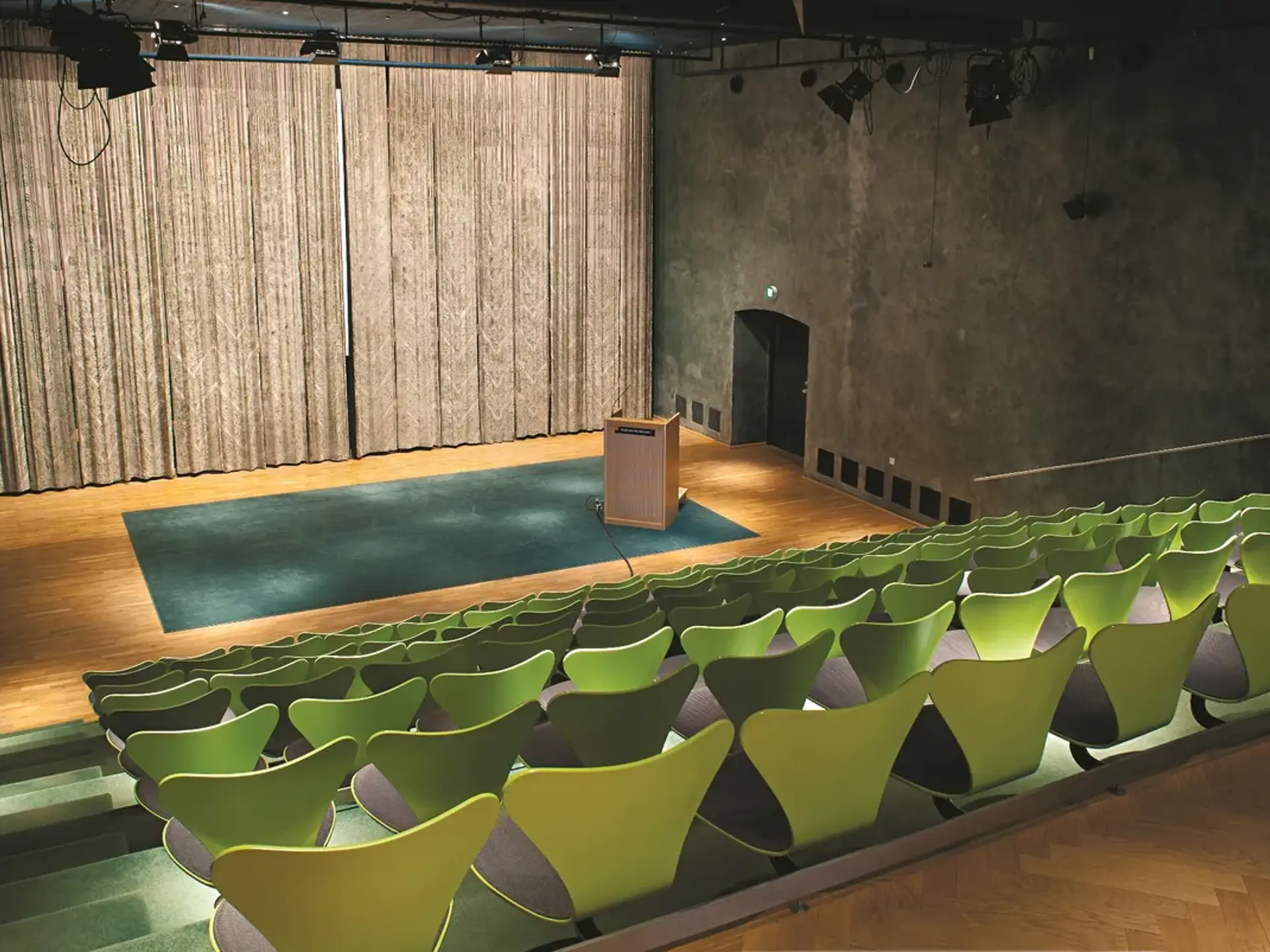 Det moderne biografteater på 170 m² er perfekt til præsentationer og foredrag. Biografen har 125 fastmonterede sæder og plads til op til 176 personer med ekstra stolerækker.