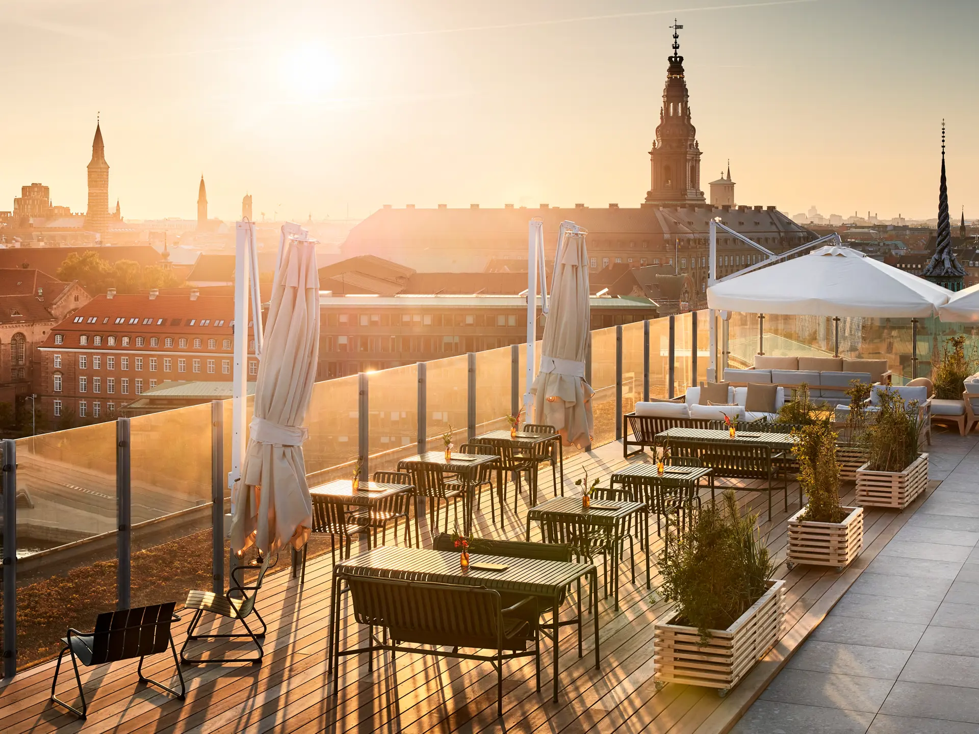 - Tagterrassen ROOF Bar & Lounge: I sommerhalvåret, fra april til oktober, er vores tagterrasse åben. Denne eksklusive bar og lounge er perfekt til uformelle sammenkomster og giver en storslået udsigt over København.
