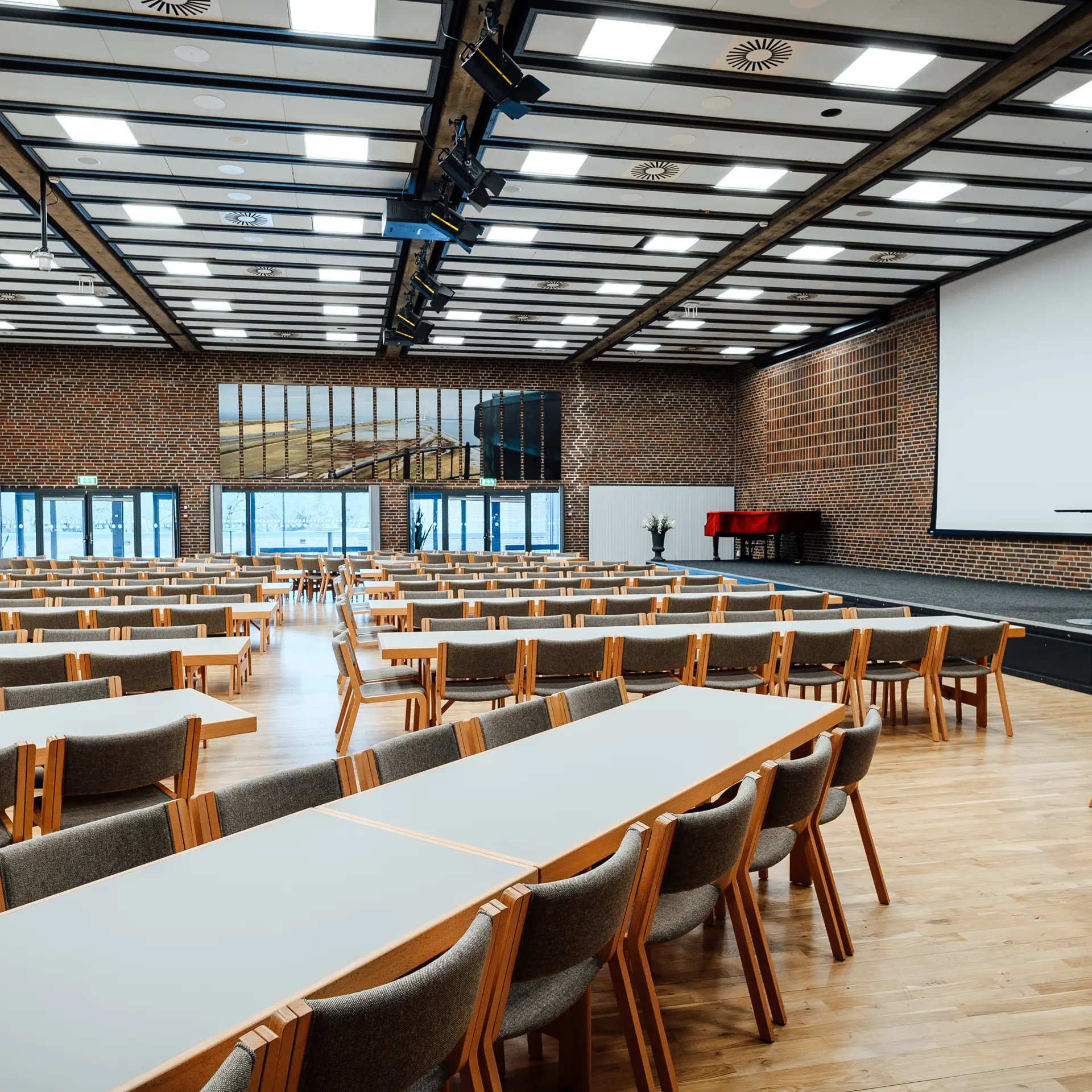 Alle vores lokaler er udstyret med det nyeste inden for AV-teknologi. Dette inkluderer projektorer, lydsystemer, trådløs internetadgang, klimaanlæg og elektronisk lysstyring. Vores tekniske team, kendt som de "røde mænd", står altid klar til at hjælpe med opsætning og teknisk support under dit arrangement, så alt forløber gnidningsfrit.