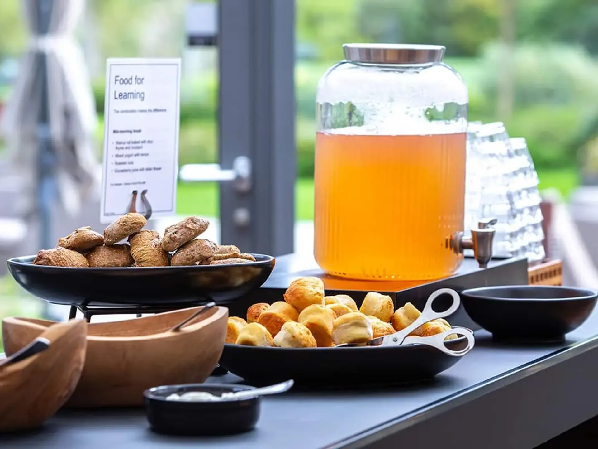 Med vores Næring til Læring koncept sikrer vi, at deltagerne får stabilt blodsukker og energi til hjernen. Vores pause-forplejning består af en afbalanceret blanding af fibre, proteiner og frugtsukker, serveret i passende mængder både om formiddagen og eftermiddagen.