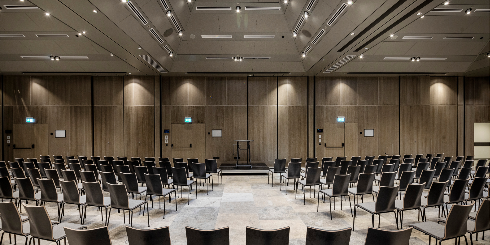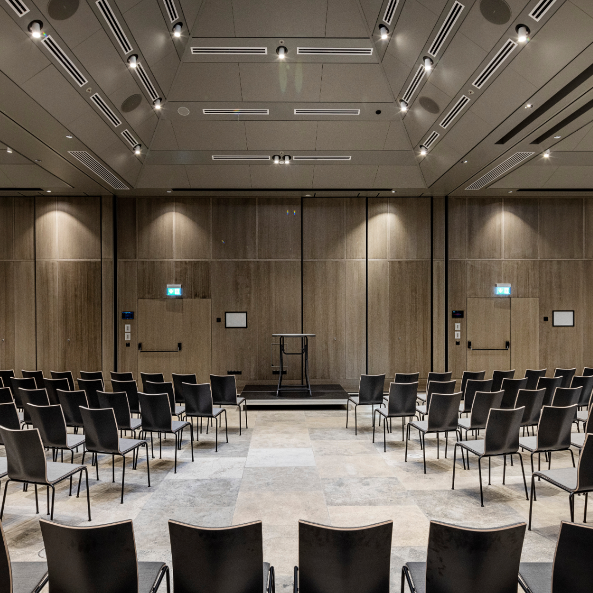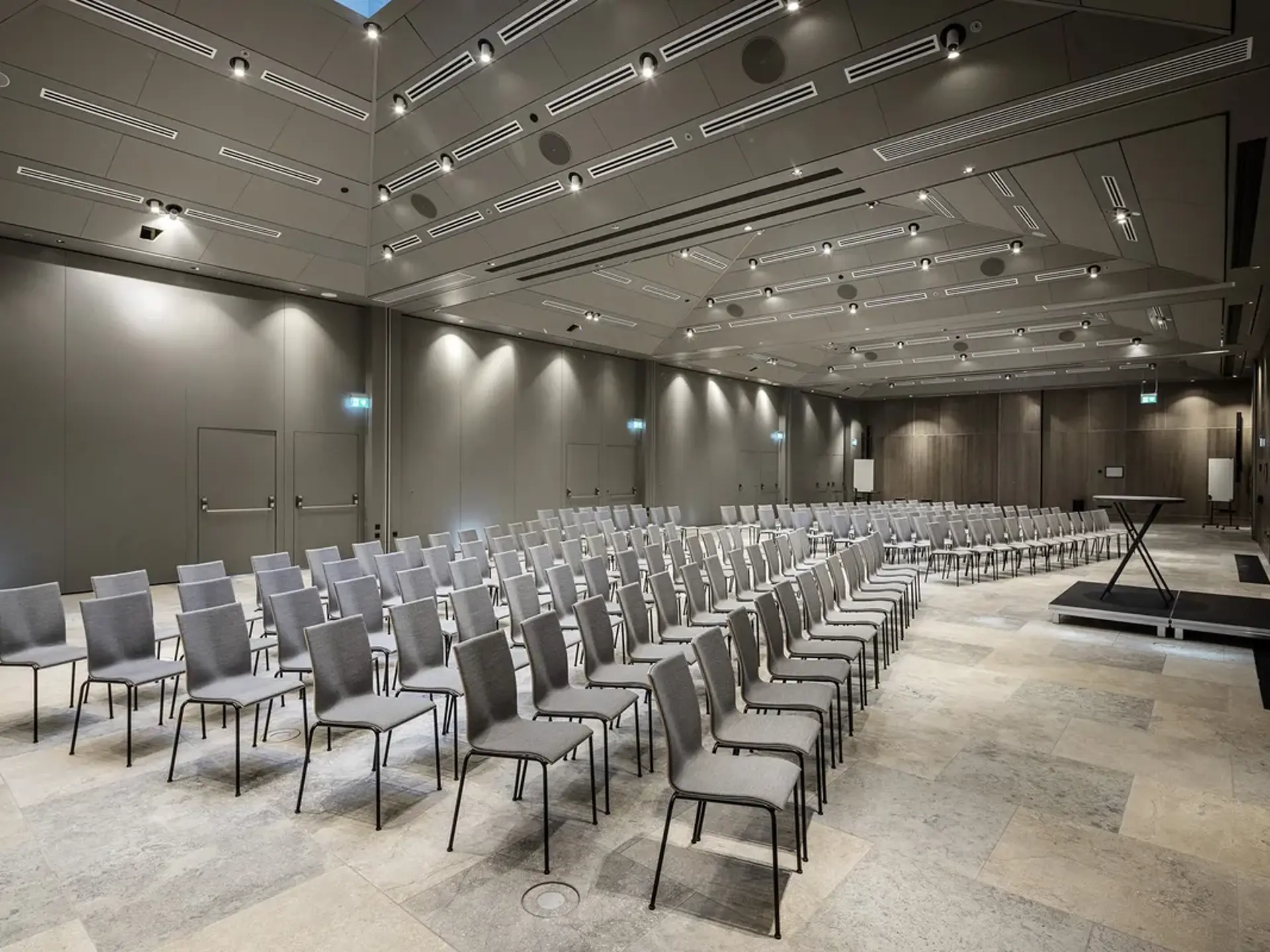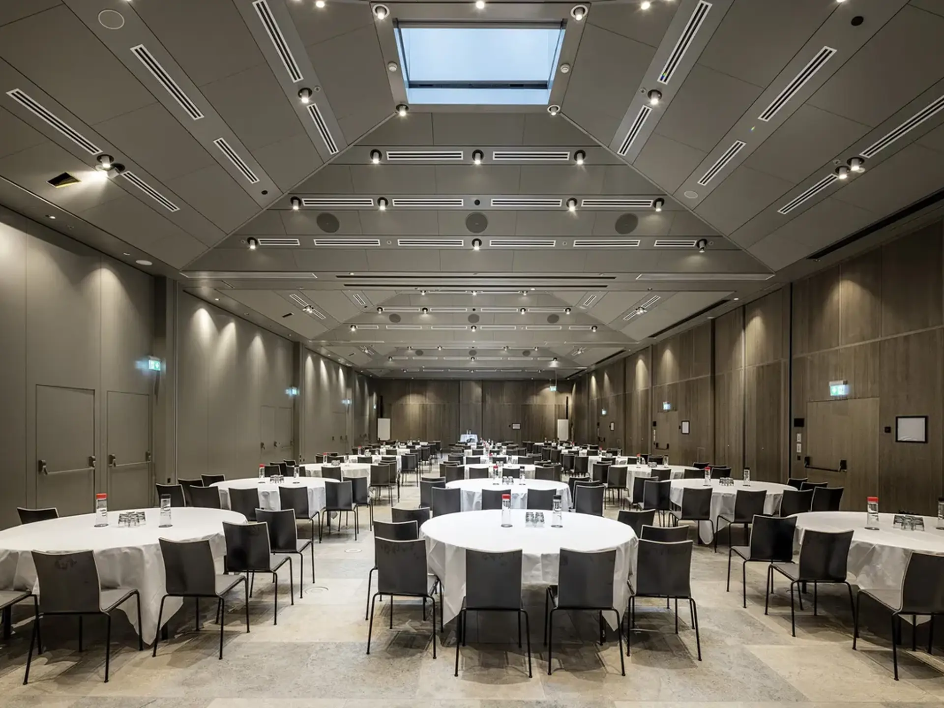 I stueplan ligger et fleksibelt eventområde, der kan deles op i 2 til 4 separate lokaler eller åbnes op til ét areal med plads til de helt store events.