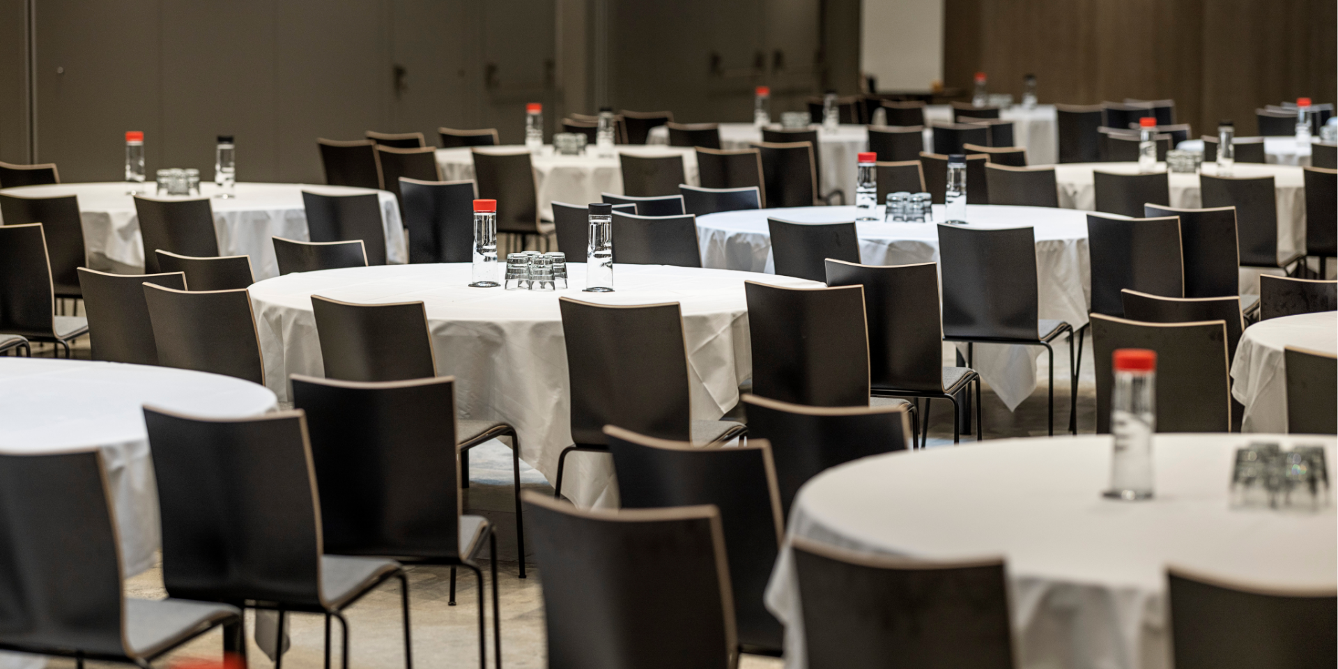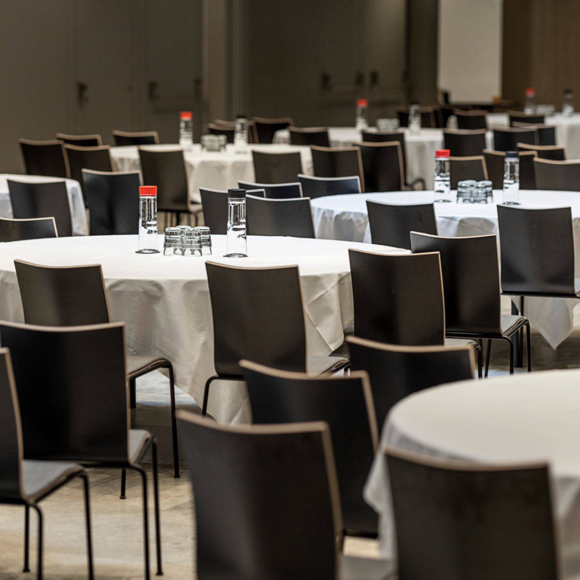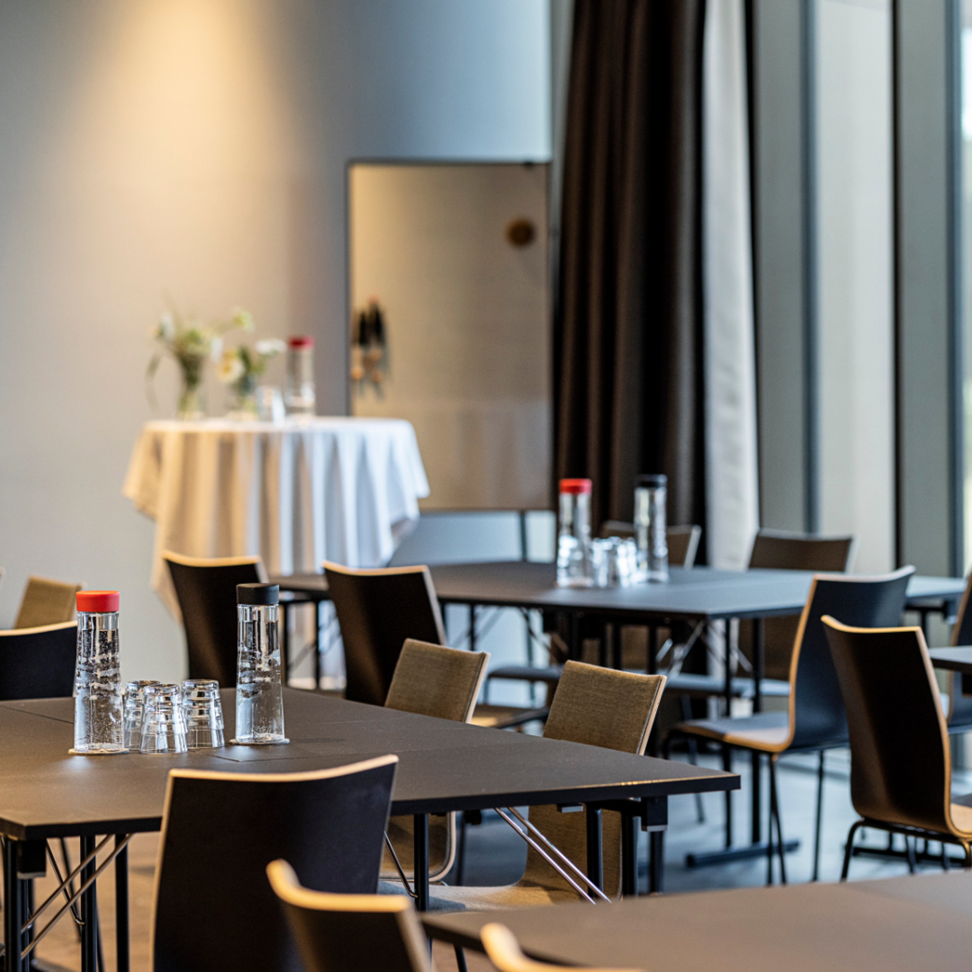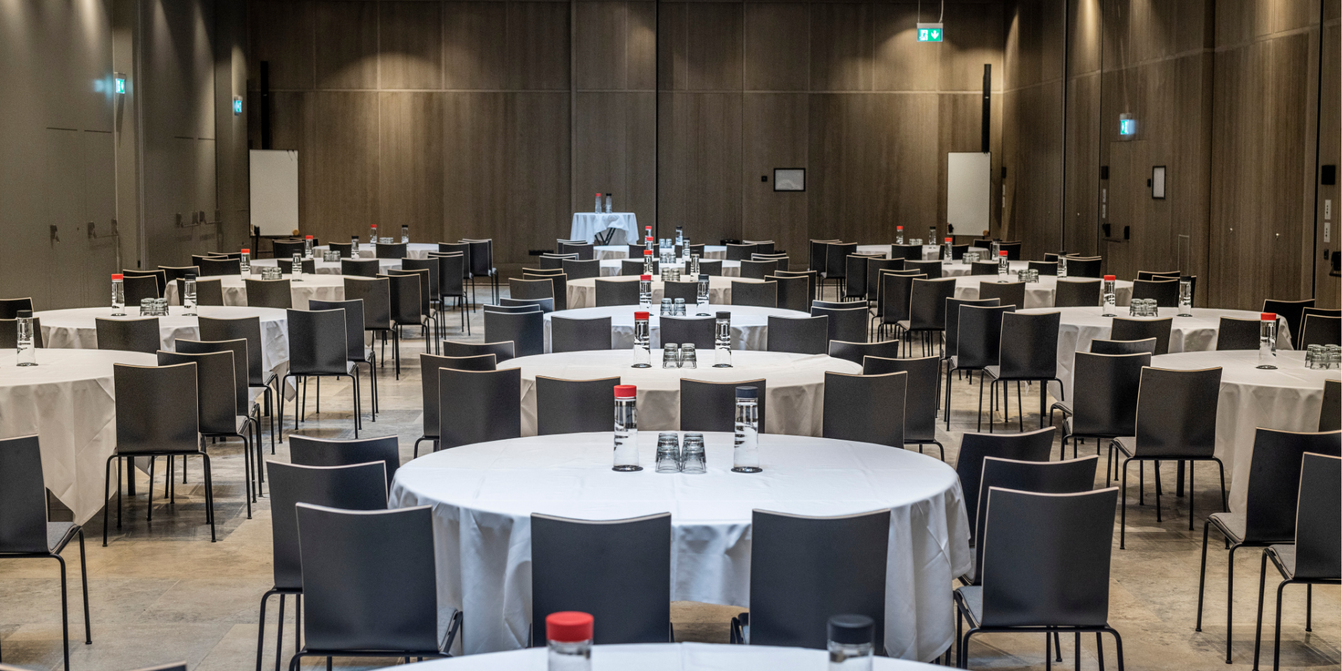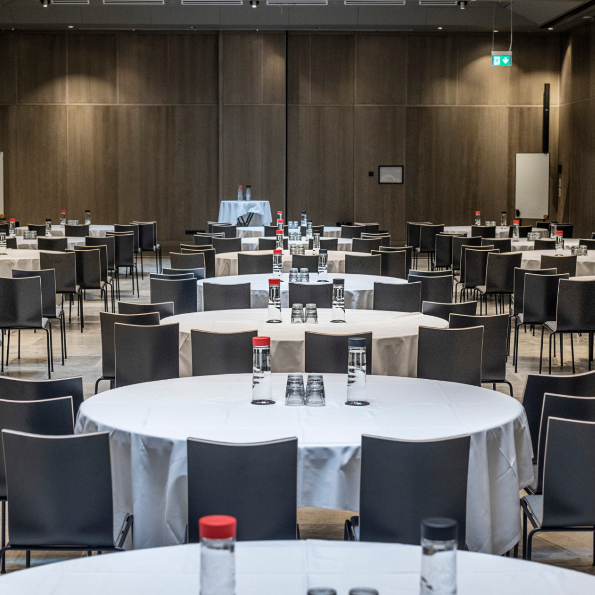 I stueplan ligger et fleksibelt eventområde, der kan deles op i 2 til 4 separate lokaler eller åbnes op til ét areal med plads til de helt store events.