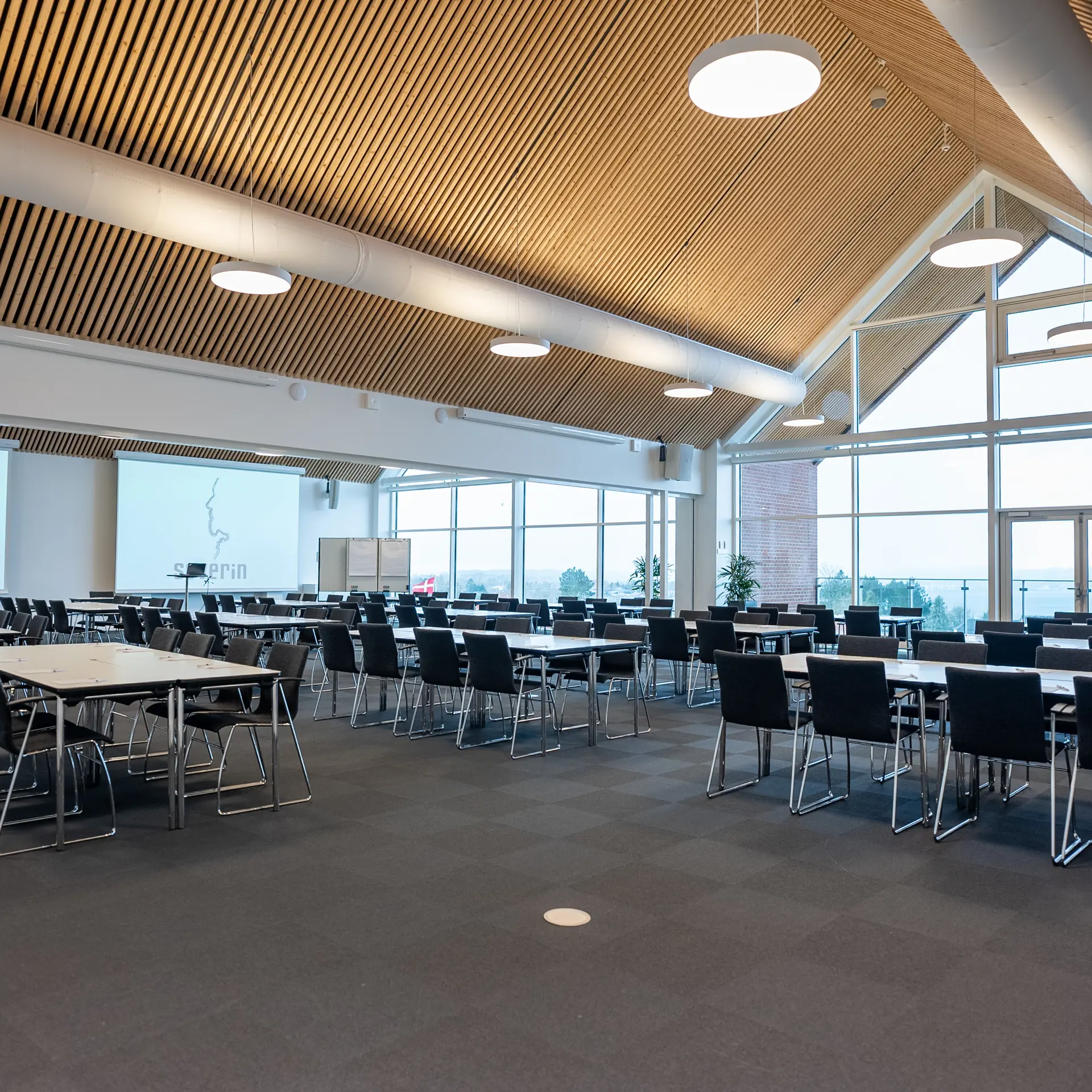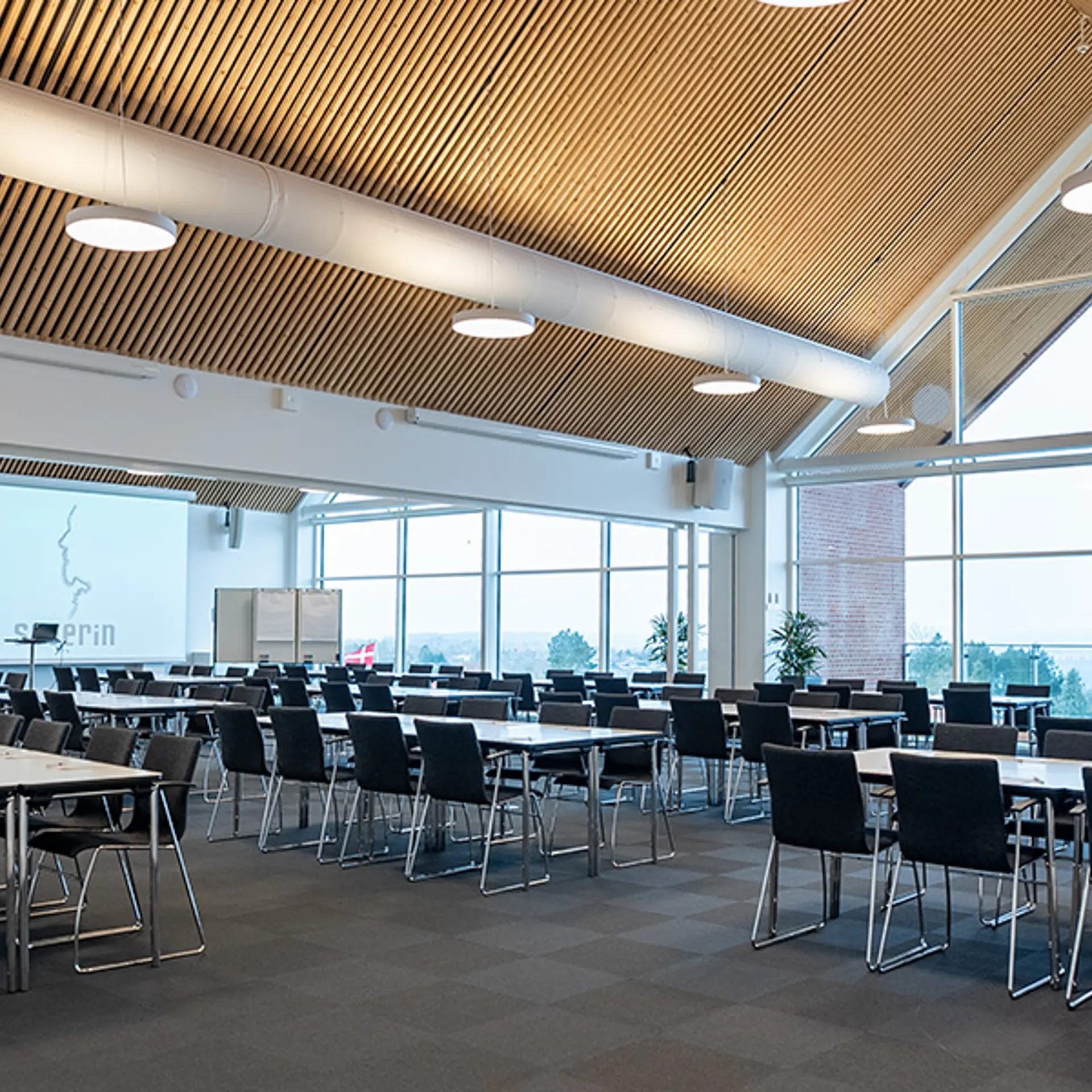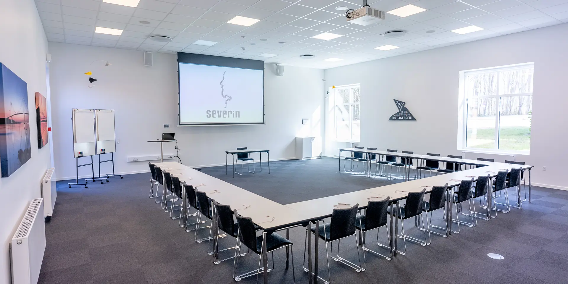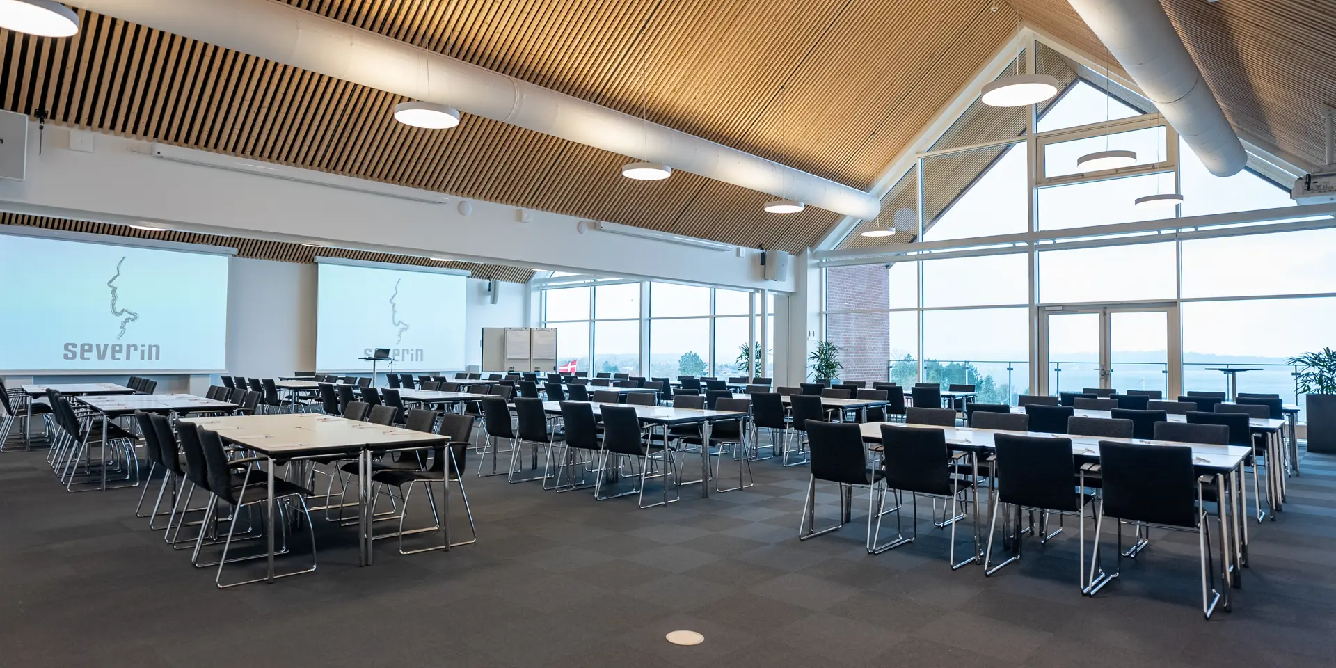 Severin ligger på en bakketop i Middelfart, hvilket giver en betagende panoramaudsigt over vandet og de to broer. Vores nye konferencebygning byder på otte store konferencelokaler, hvoraf de største lokaler, Himmel og Hav, samt Bro og Bælt, er forsynet med store vinduer, der lader naturligt lys strømme ind. Denne unikke placering gør det muligt at lade sig inspirere af den naturlige skønhed, mens du afholder dit møde eller kursus.