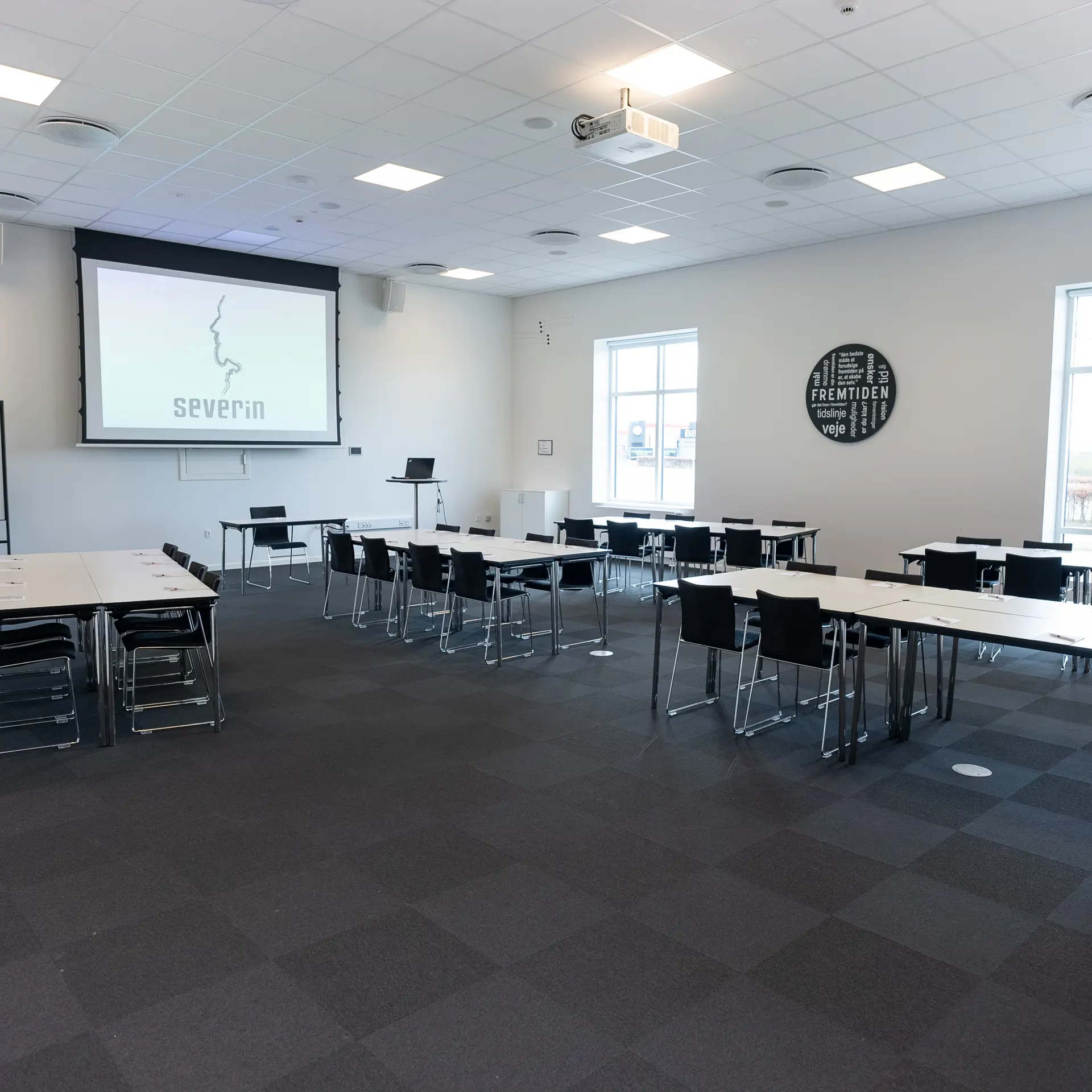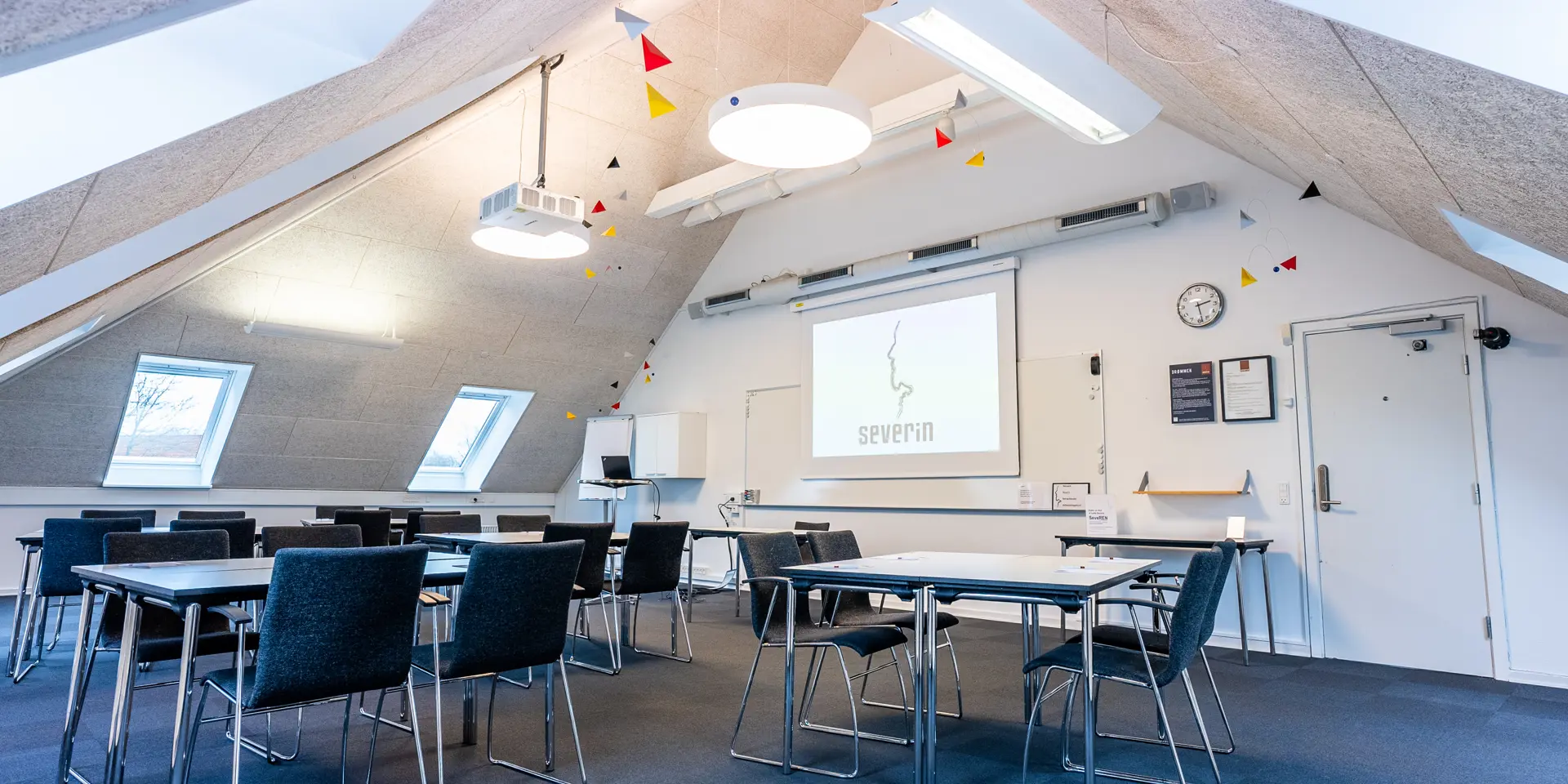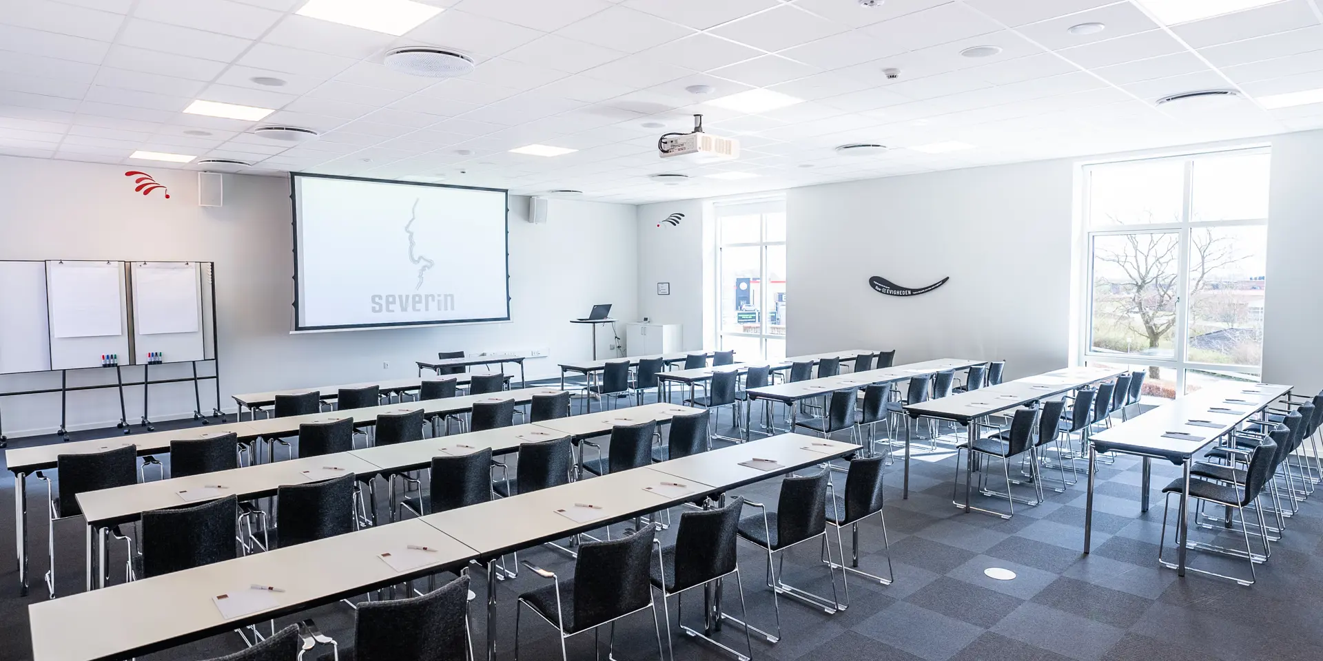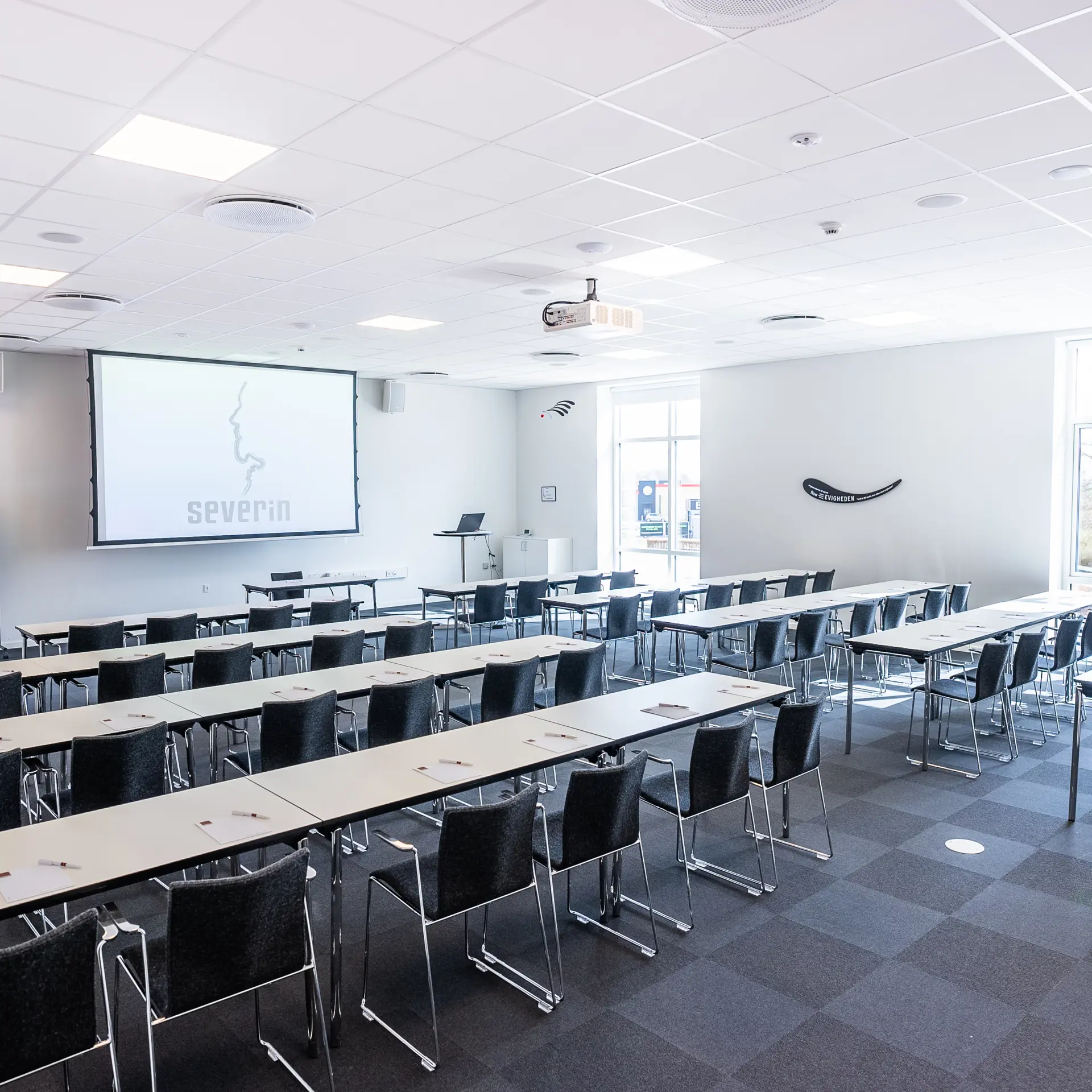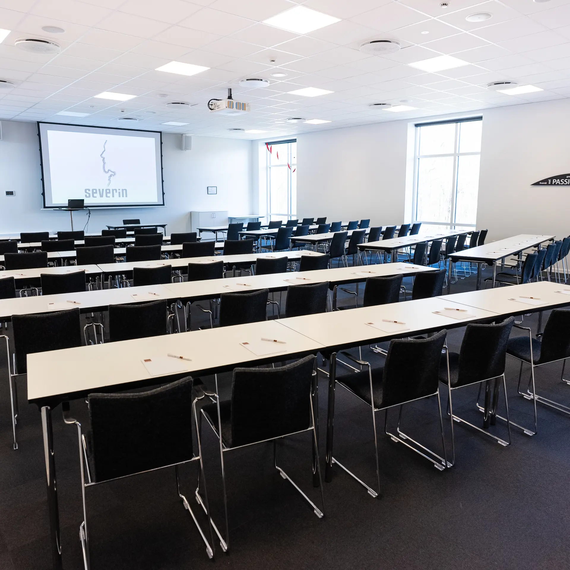 Severin ligger på en bakketop i Middelfart, hvilket giver en betagende panoramaudsigt over vandet og de to broer. Vores nye konferencebygning byder på otte store konferencelokaler, hvoraf de største lokaler, Himmel og Hav, samt Bro og Bælt, er forsynet med store vinduer, der lader naturligt lys strømme ind. Denne unikke placering gør det muligt at lade sig inspirere af den naturlige skønhed, mens du afholder dit møde eller kursus.