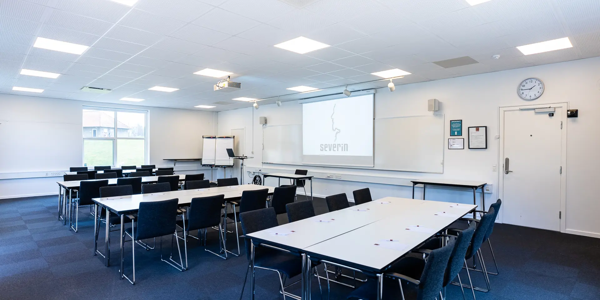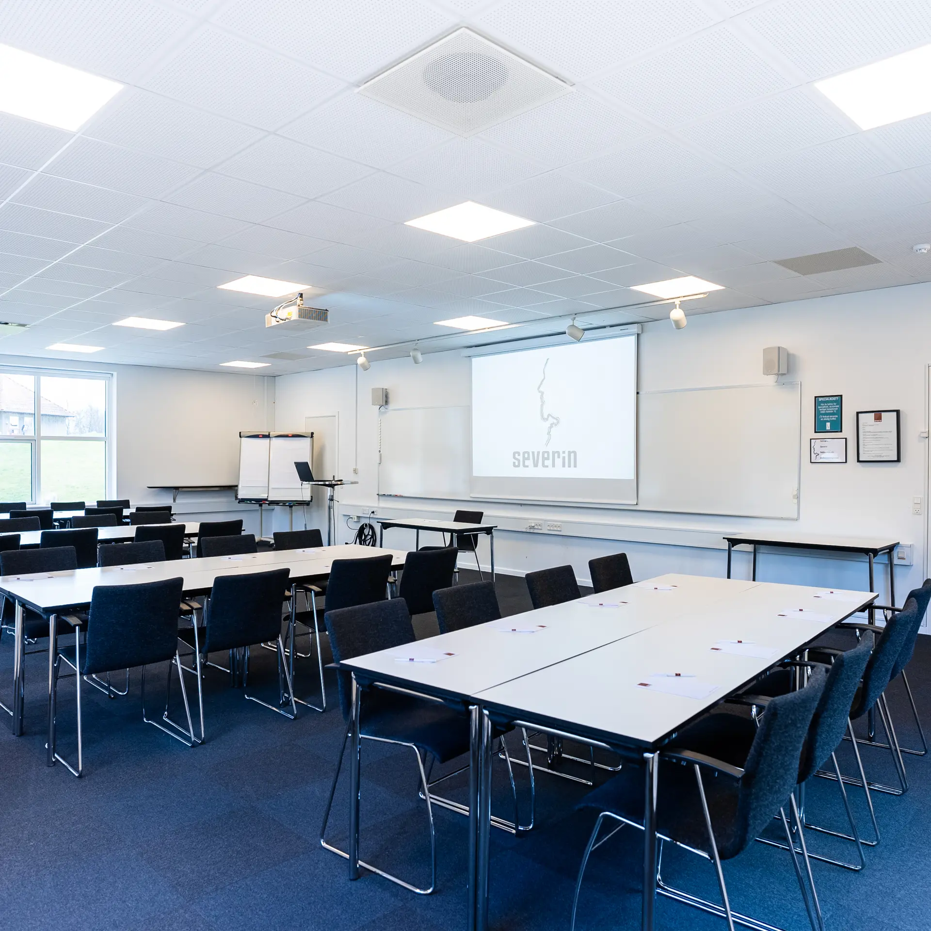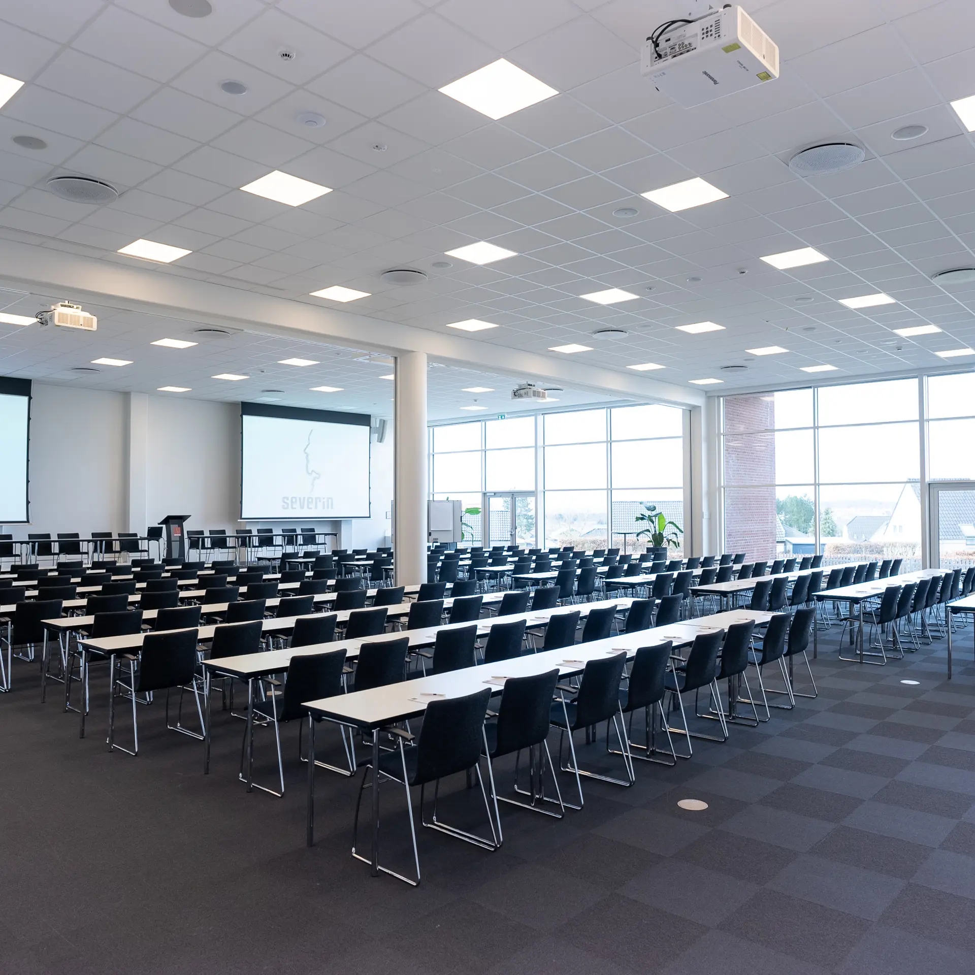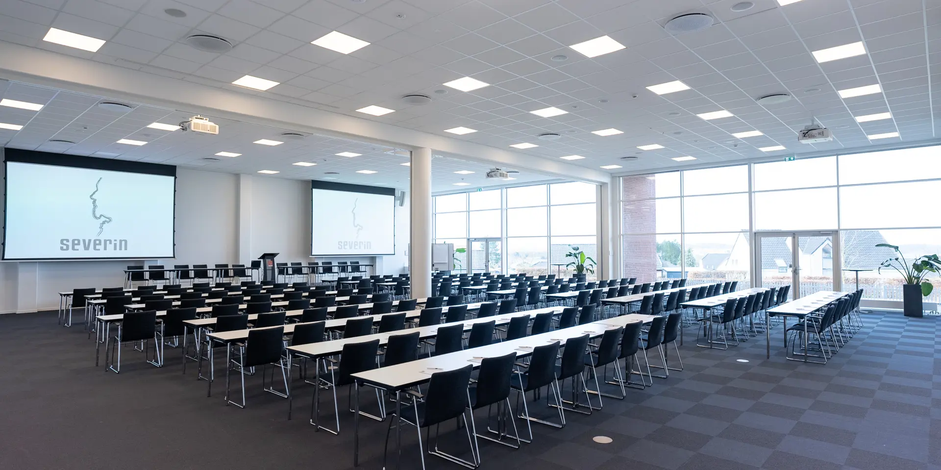 Severin ligger på en bakketop i Middelfart, hvilket giver en betagende panoramaudsigt over vandet og de to broer. Vores nye konferencebygning byder på otte store konferencelokaler, hvoraf de største lokaler, Himmel og Hav, samt Bro og Bælt, er forsynet med store vinduer, der lader naturligt lys strømme ind. Denne unikke placering gør det muligt at lade sig inspirere af den naturlige skønhed, mens du afholder dit møde eller kursus.