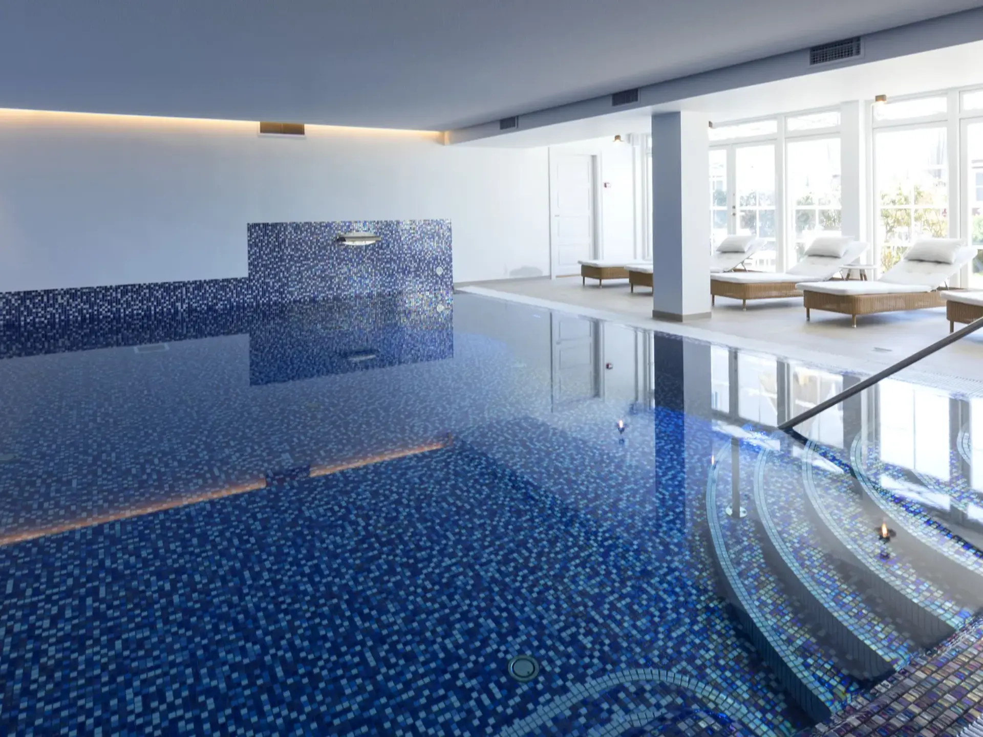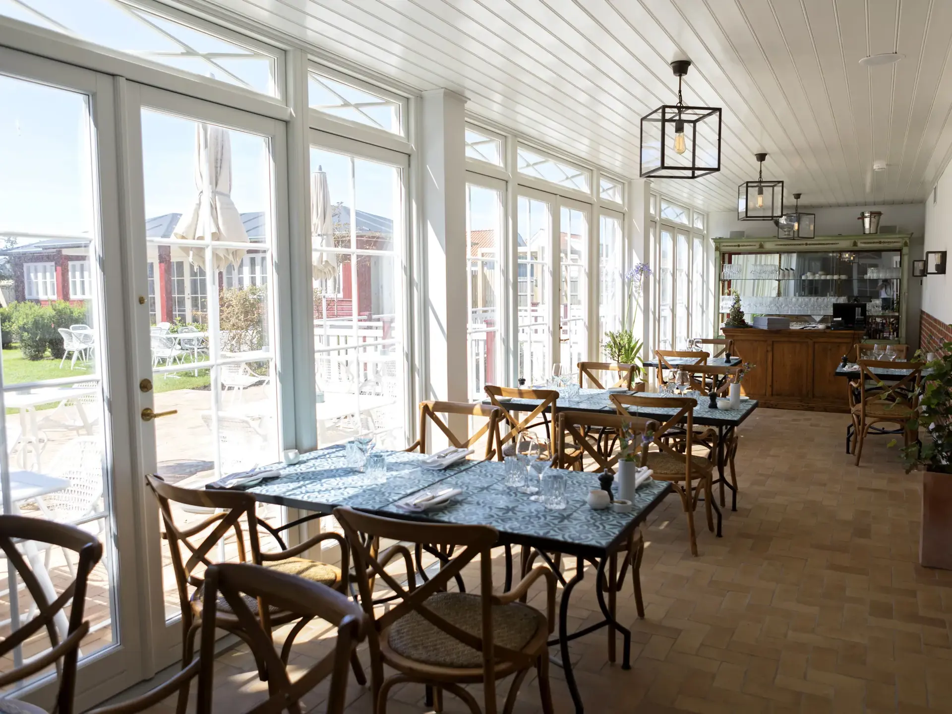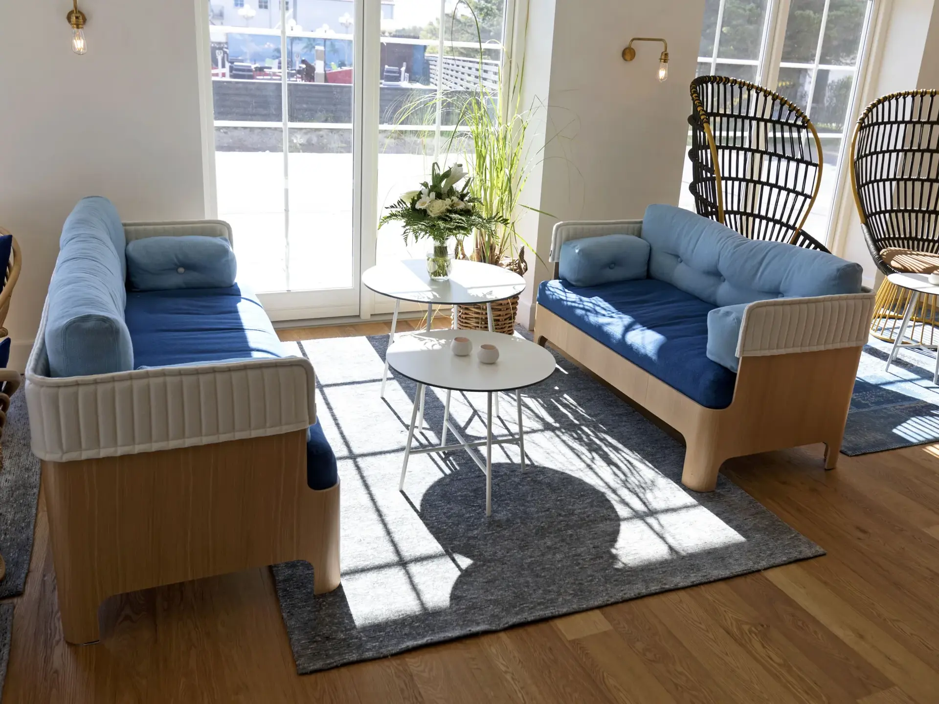 Når du træder ind i vores konference hotel, bliver du mødt af en behagelig og rolig atmosfære. De bløde nuancer af træ og naturlige elementer skaber en følelse af jordforbindelse og afslappethed. Lyset filtrerer ind gennem vinduerne, og du kan næsten høre bølgernes rolige brus i det fjerne.