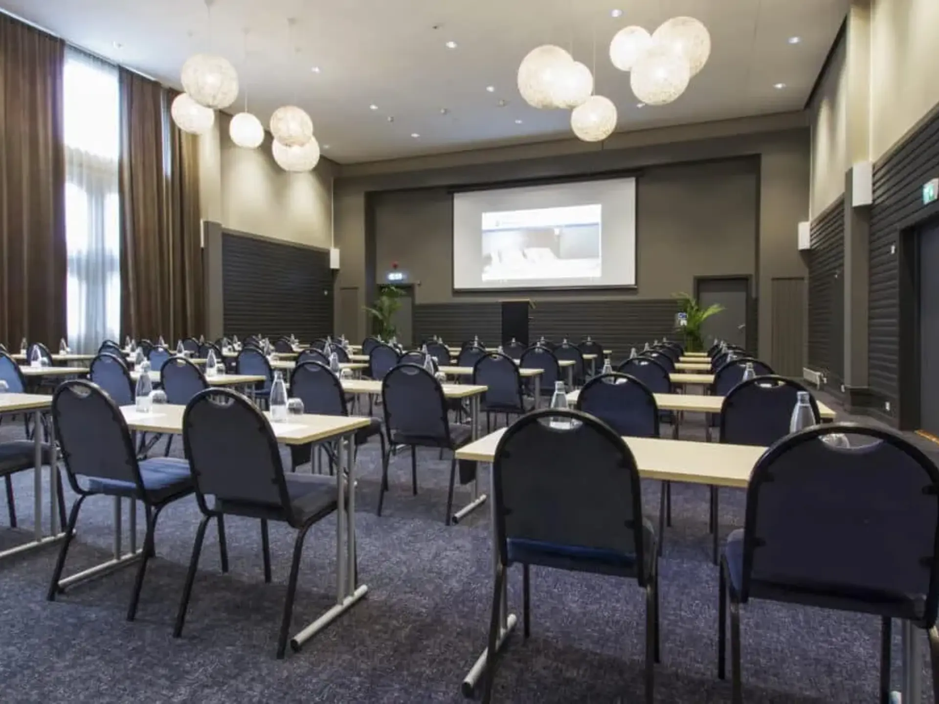 Den store Fjordsal kan opdeles i to mødelokaler efter behov. Her er der installeret et nyt billed- og lydsystem med trådløse mikrofoner.