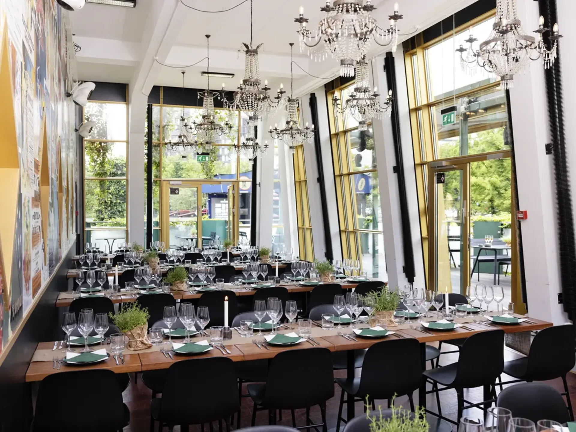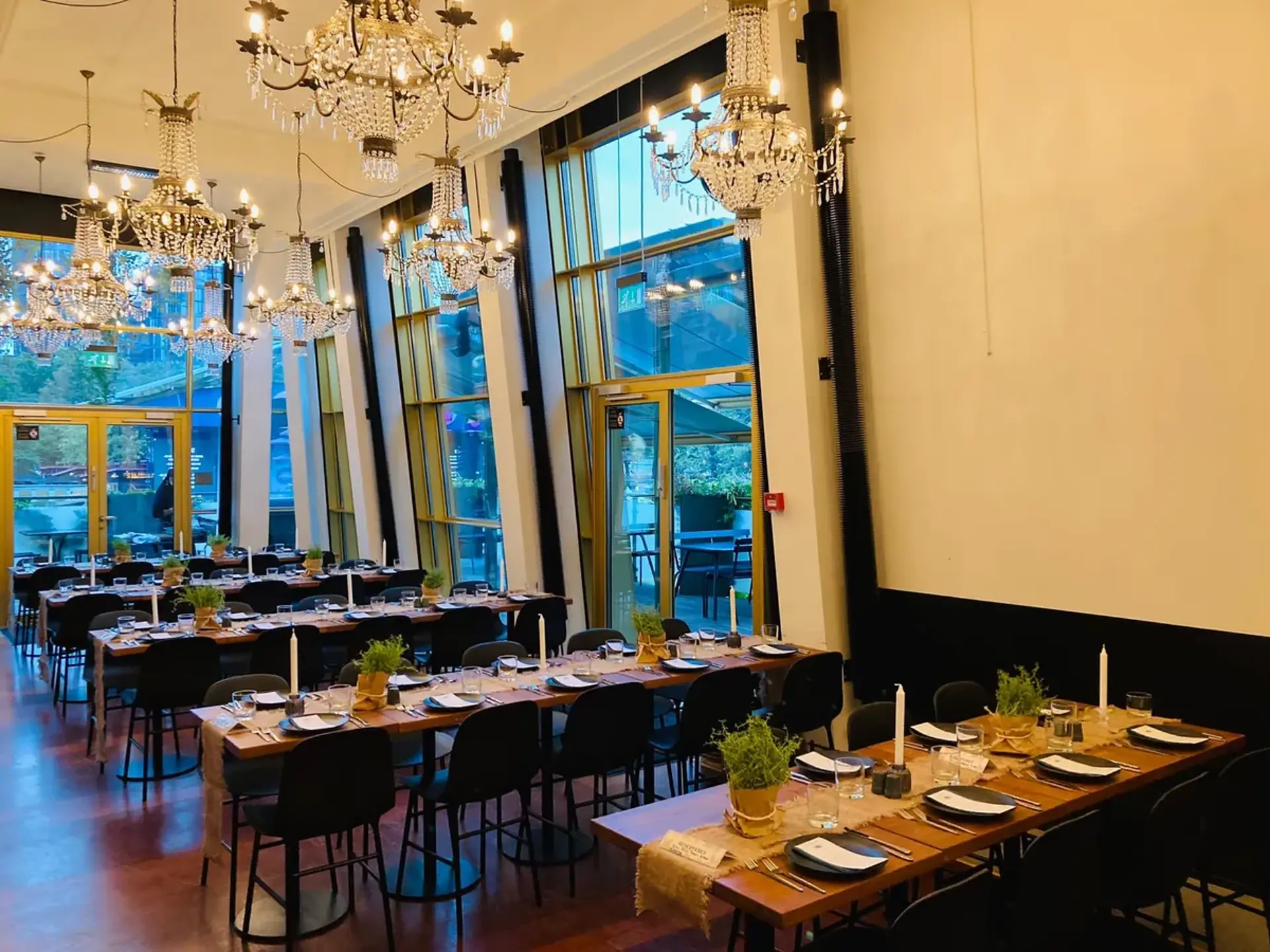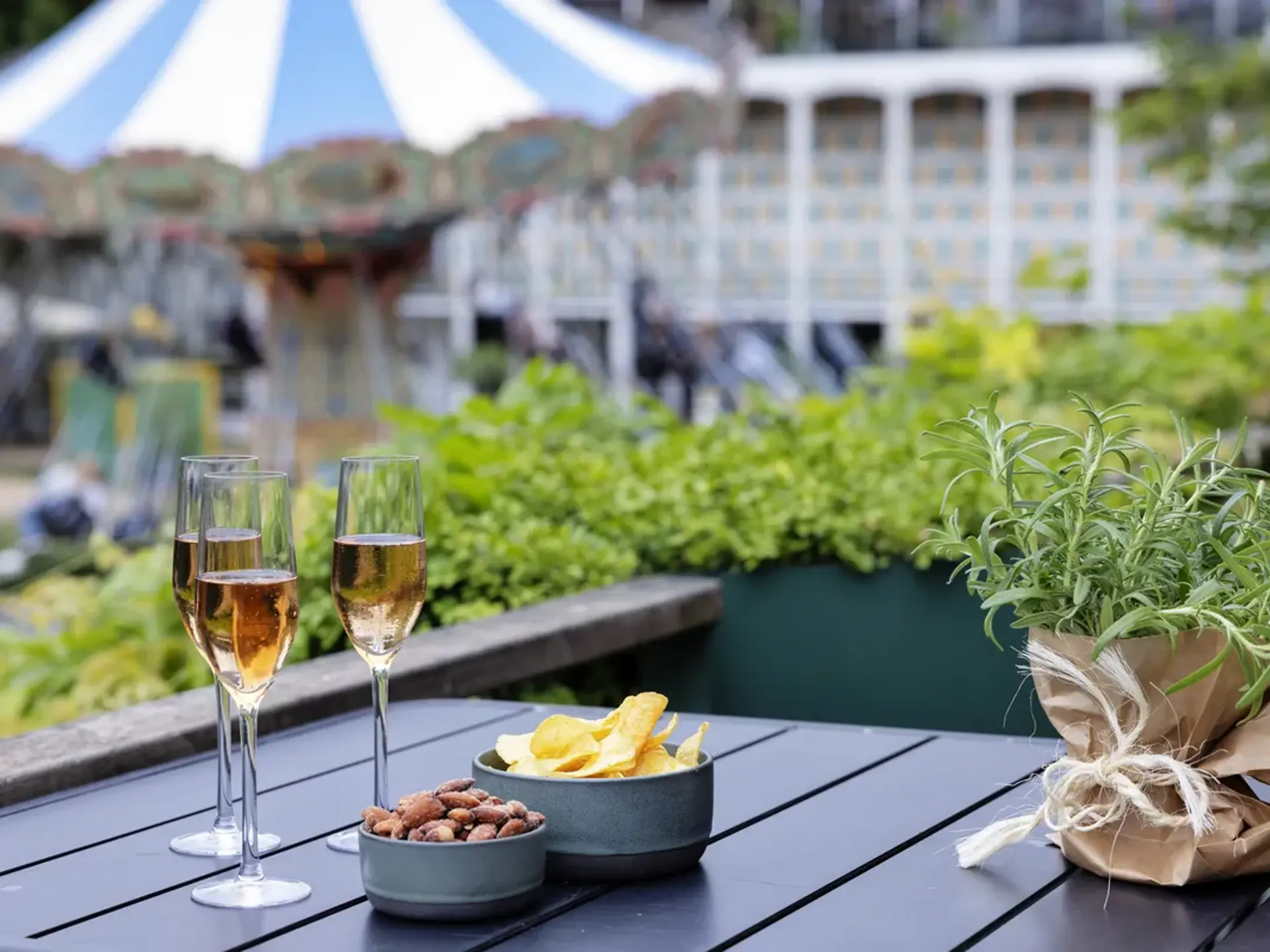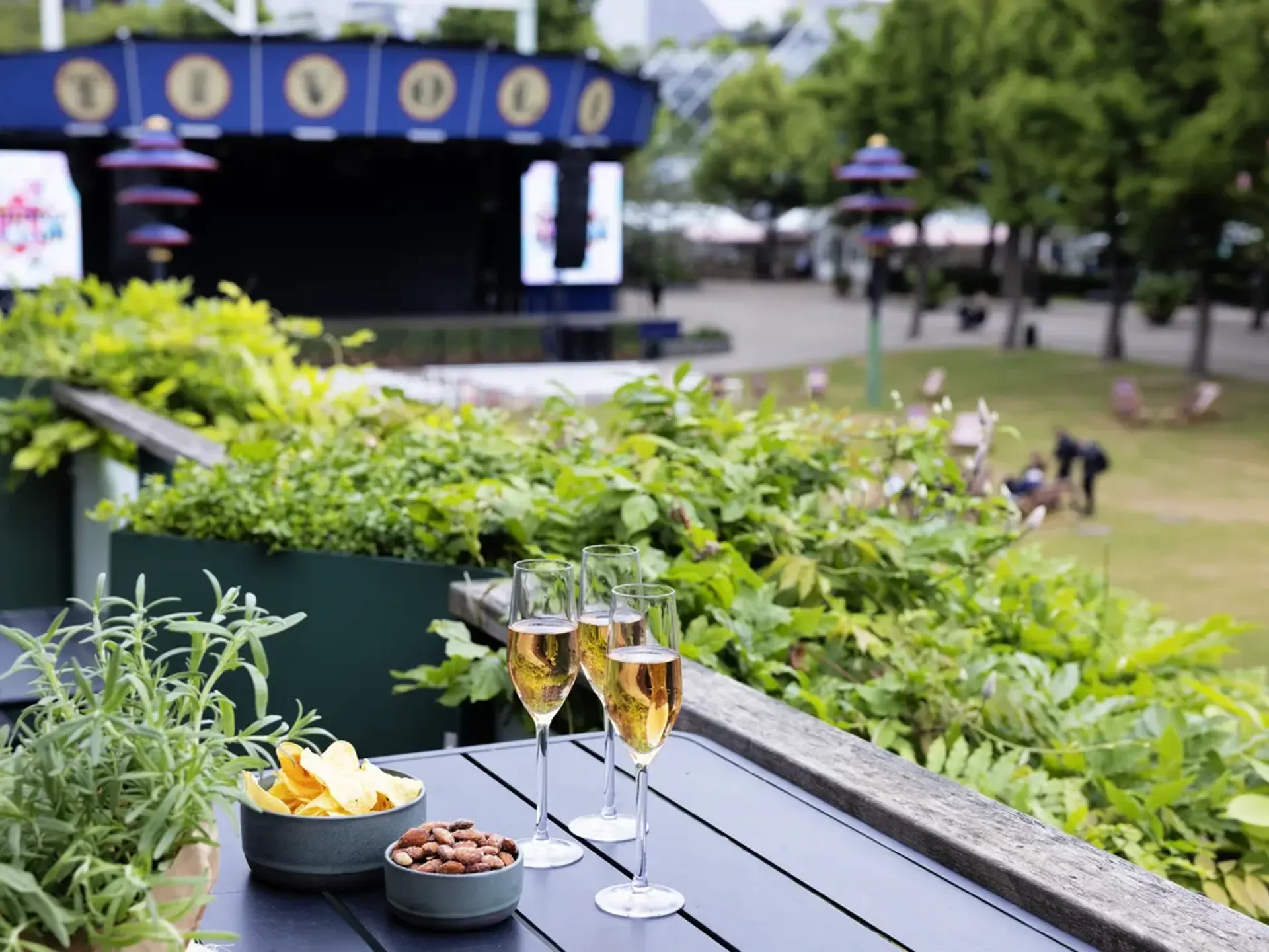 Vores festlokale er smukt pyntet med gamle Tivoli-plakater og lysekroner, det tilstødende barlokale har udsigt til Ballongyngen og så er der den store terrasse hvor der er 180 graders udsigt ud over Plænen, Scenen, Glassalen og Koncertsalen. I vores udebar står tjenerne klar med kolde drikke og store smil!