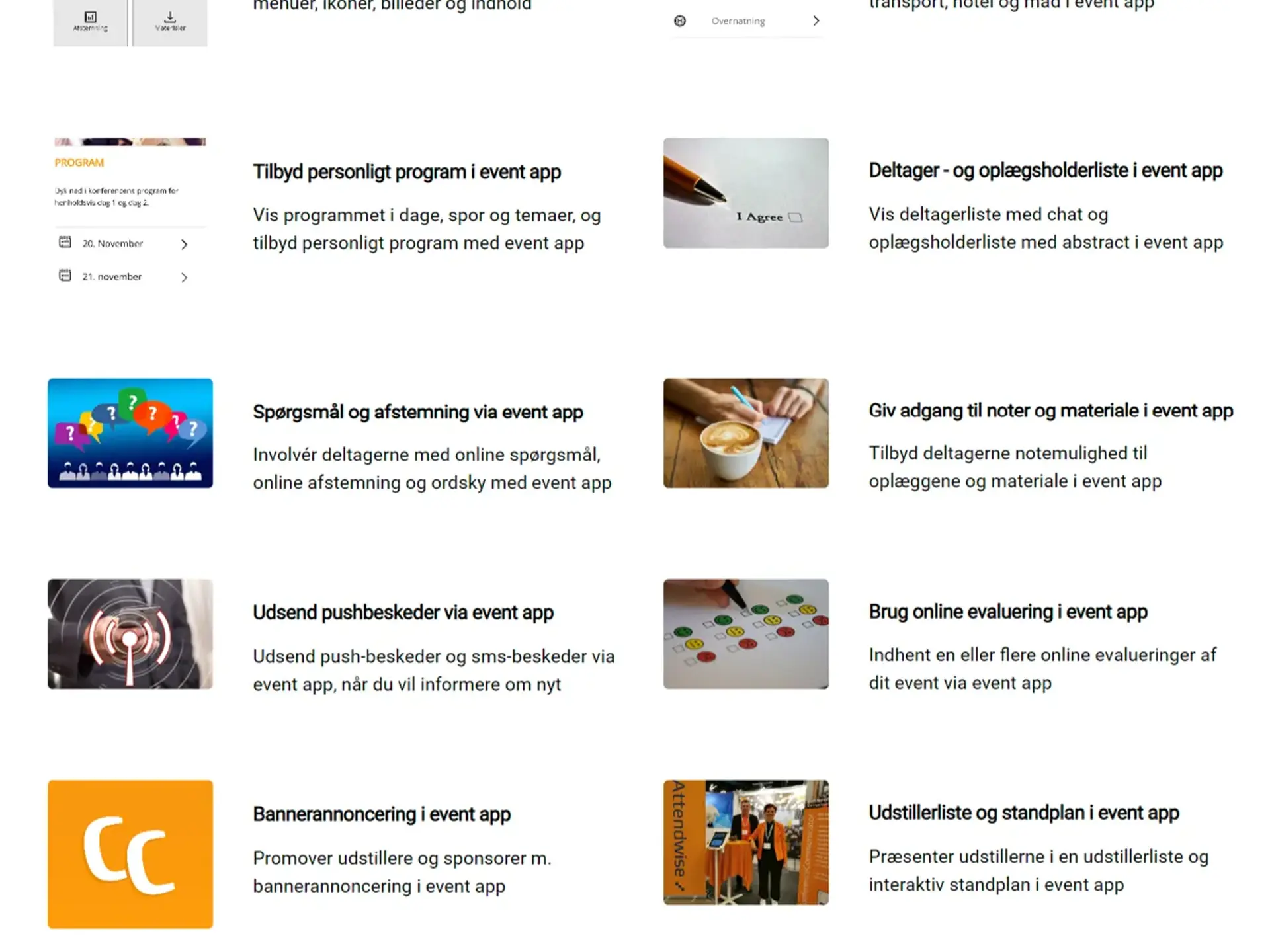 Vi tilbyder et væld af moduler og funktioner til planlægning og eksekvering af dine events, hvad enten du holder faglige konferencer eller kurser, messer, netværksevents eller medarbejderevents.