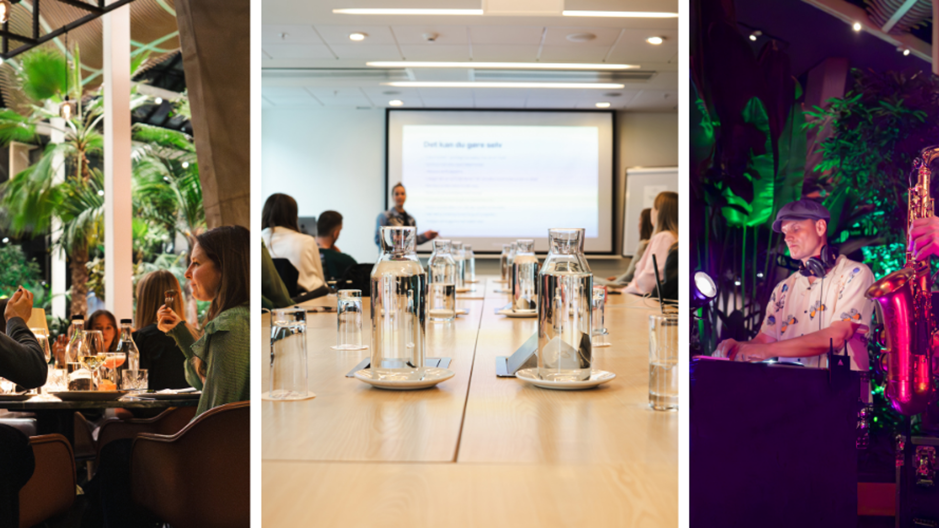 På koncertaftener tilbyder vi særlige menuer, så overgangen fra møde til middag til koncert bliver glidende. Og når scenelyset slukker i arenaen, tændes det i Atrium – med DJ, cocktails og palmer som ramme for uformelt netværk og god stemning.