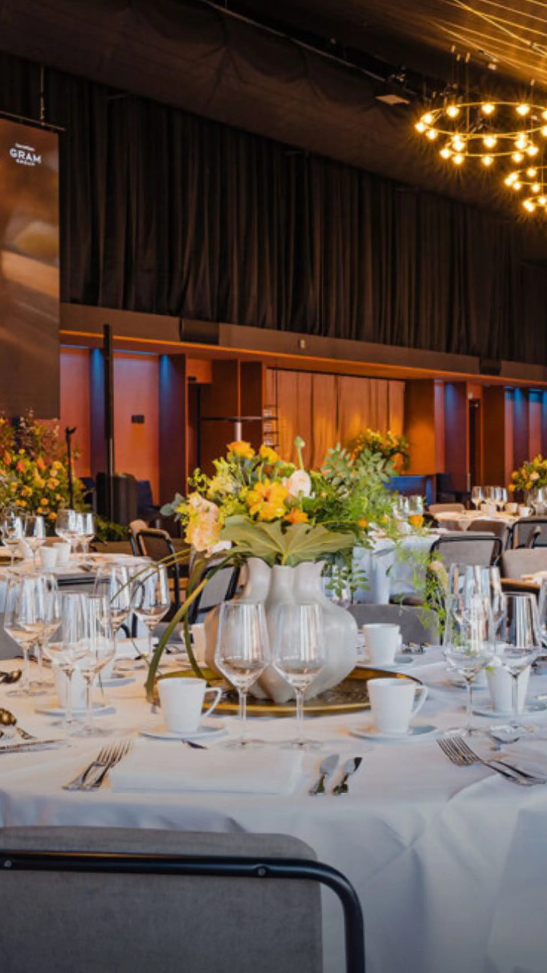 Årsmøde, 900 deltagere: Check-in via QR, plenum med panelscene, medlemsafstemning, gala-middag i samme hal med belysningsskift.